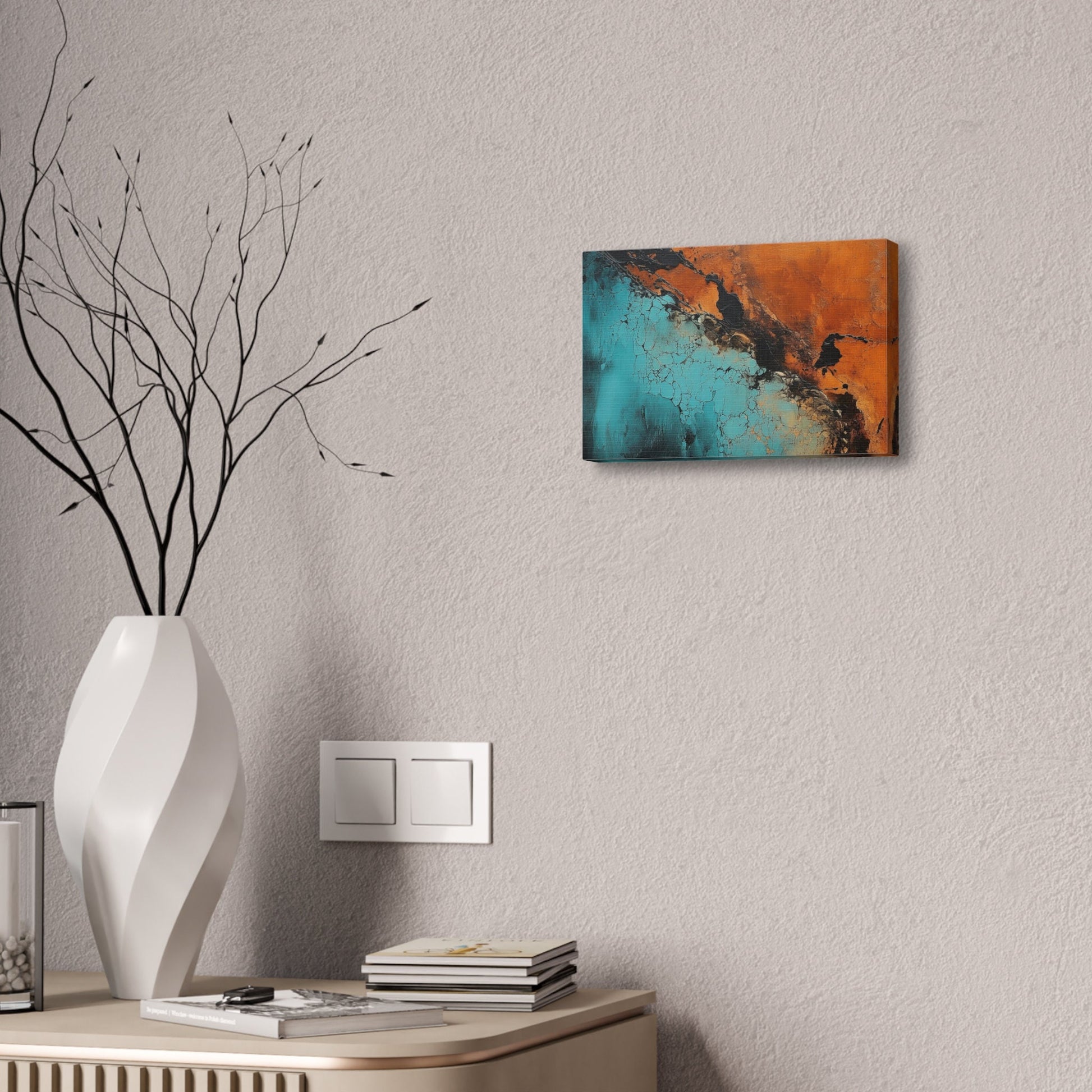 The image showcases an abstract painting that evokes a sense of organic corrosion and decay, blending burnt orange, teal, and black colors. The textures appear tactile, with crackle patterns and paint layer separations suggesting natural processes such as rusting or the drying of arid earth. The contrast between the warm orange and the cool teal creates a dynamic visual interest, while the deep blacks add depth and dimension.