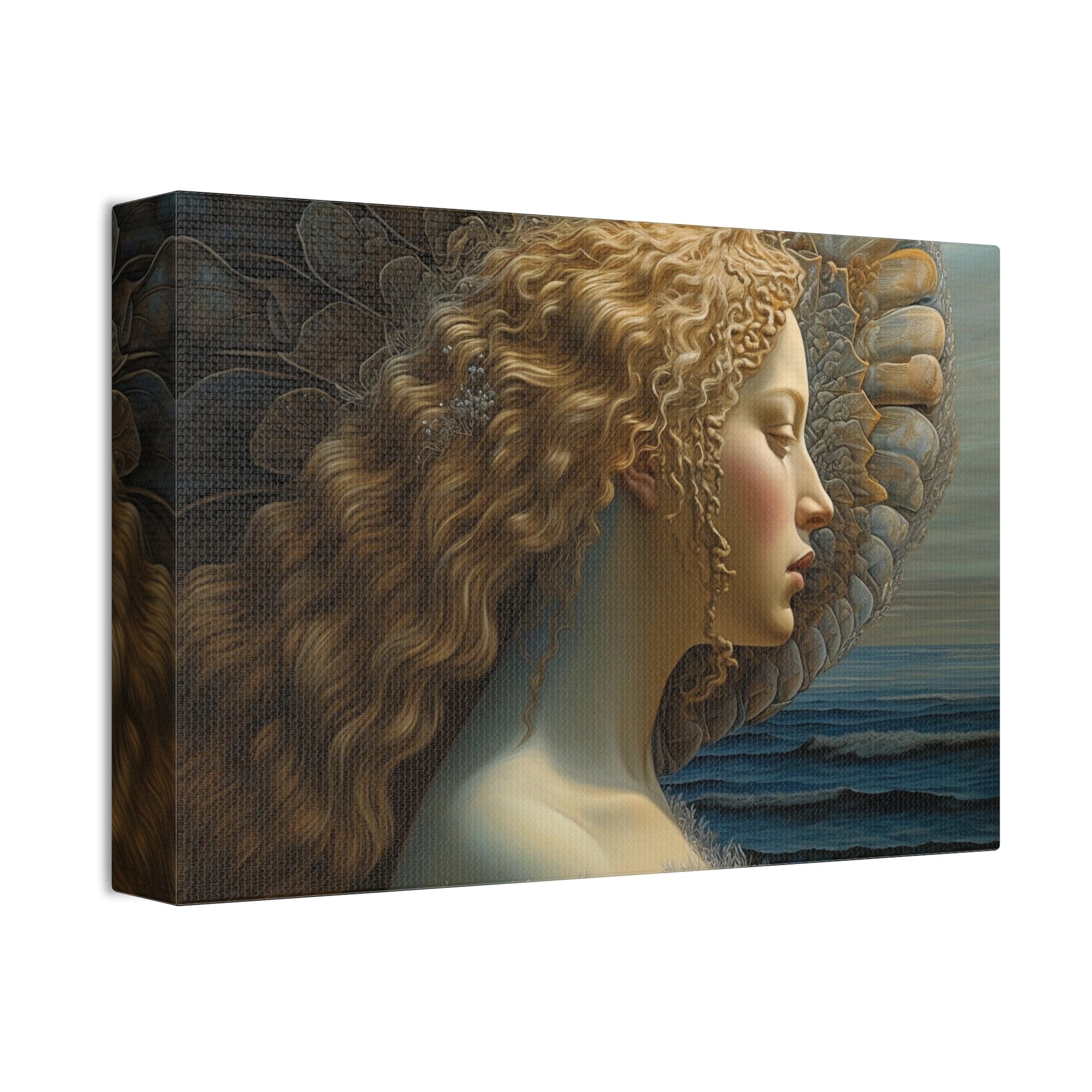Ai Wall Art: Reimagined version of Botticelli's masterpiece, The Birth of Venus from a profile view. This is a beautiful, yet haunting print