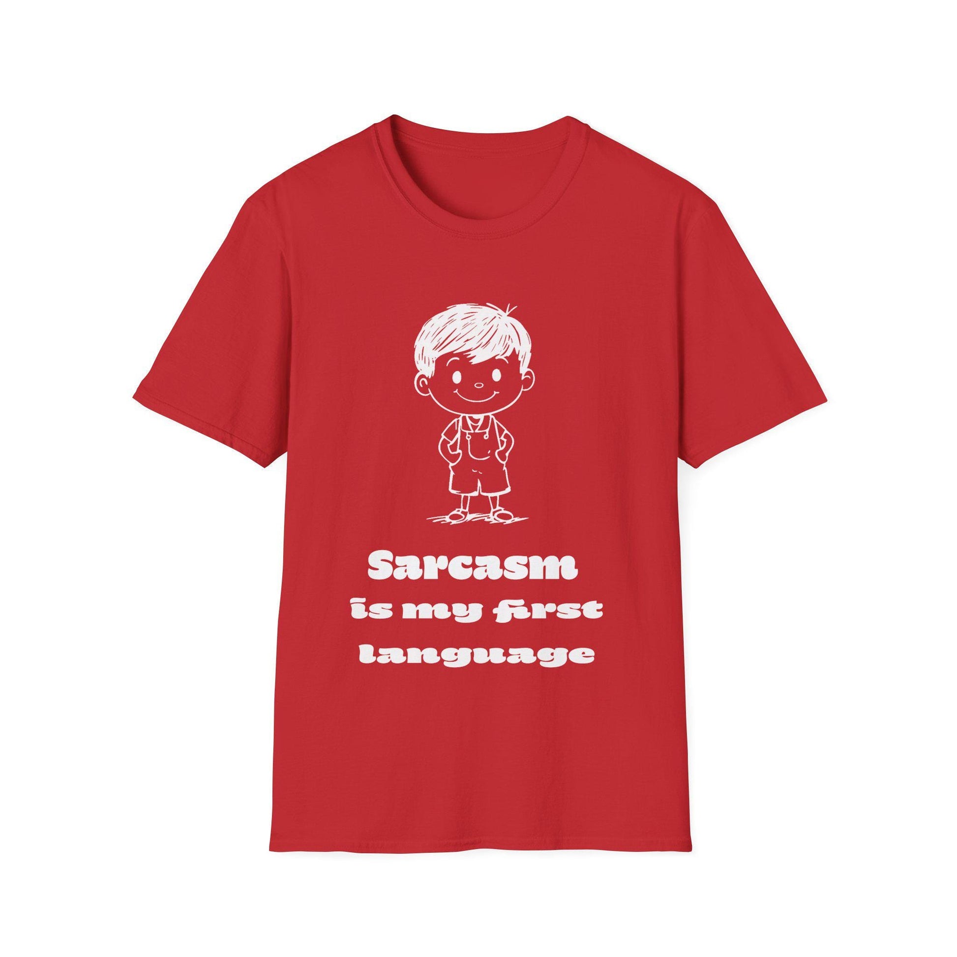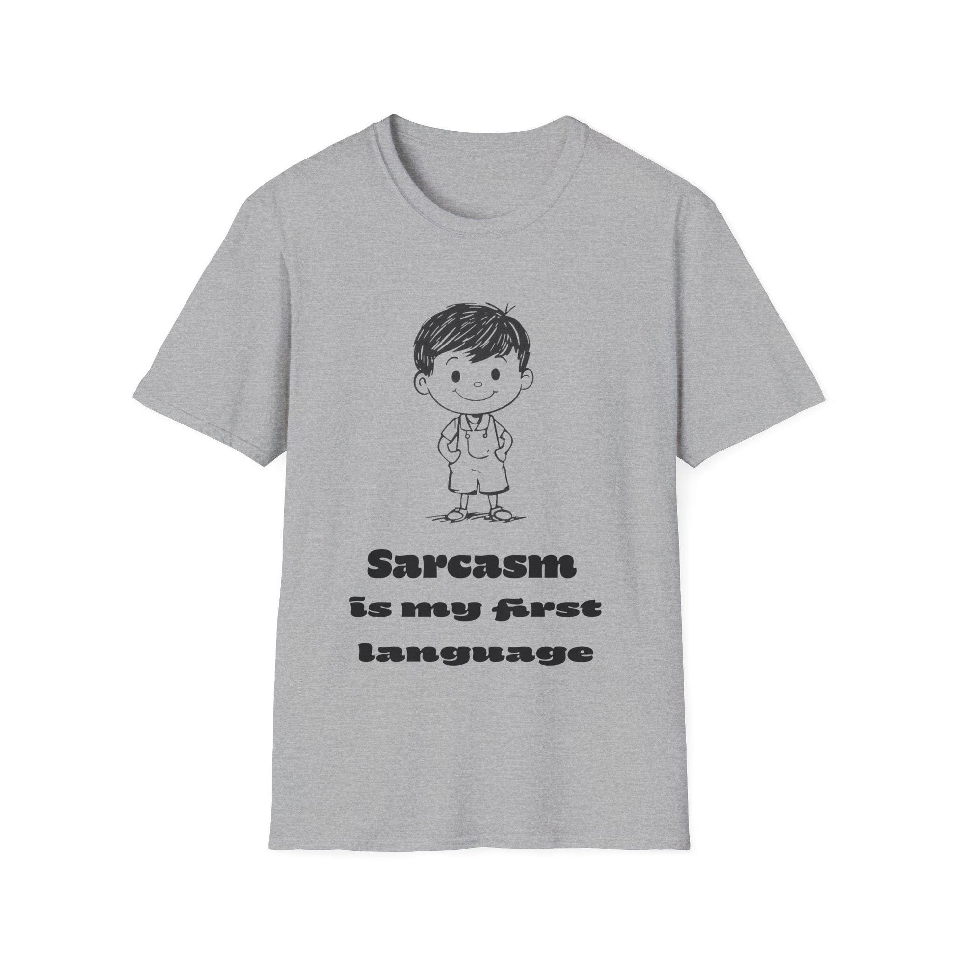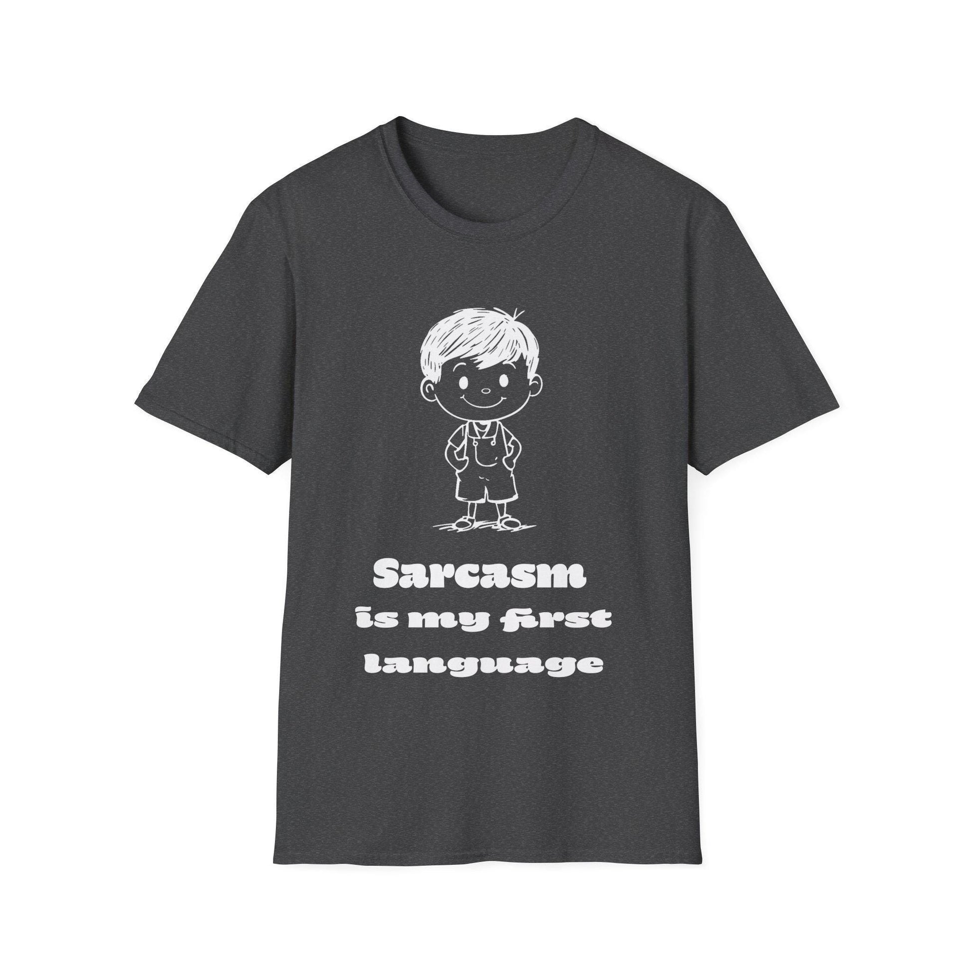 A funny Cartoon kid design with the text 'Sarcasm is my first language' printed on a comfortable unisex T-Shirt. Perfect for those who love witty humor and casual style. Ideal for adults looking for a relaxed and humorous addition to their wardrobe. Suitable for casual wear, gifts for friends with a sarcastic sense of humor, or as a fun outfit for informal gatherings and social events.