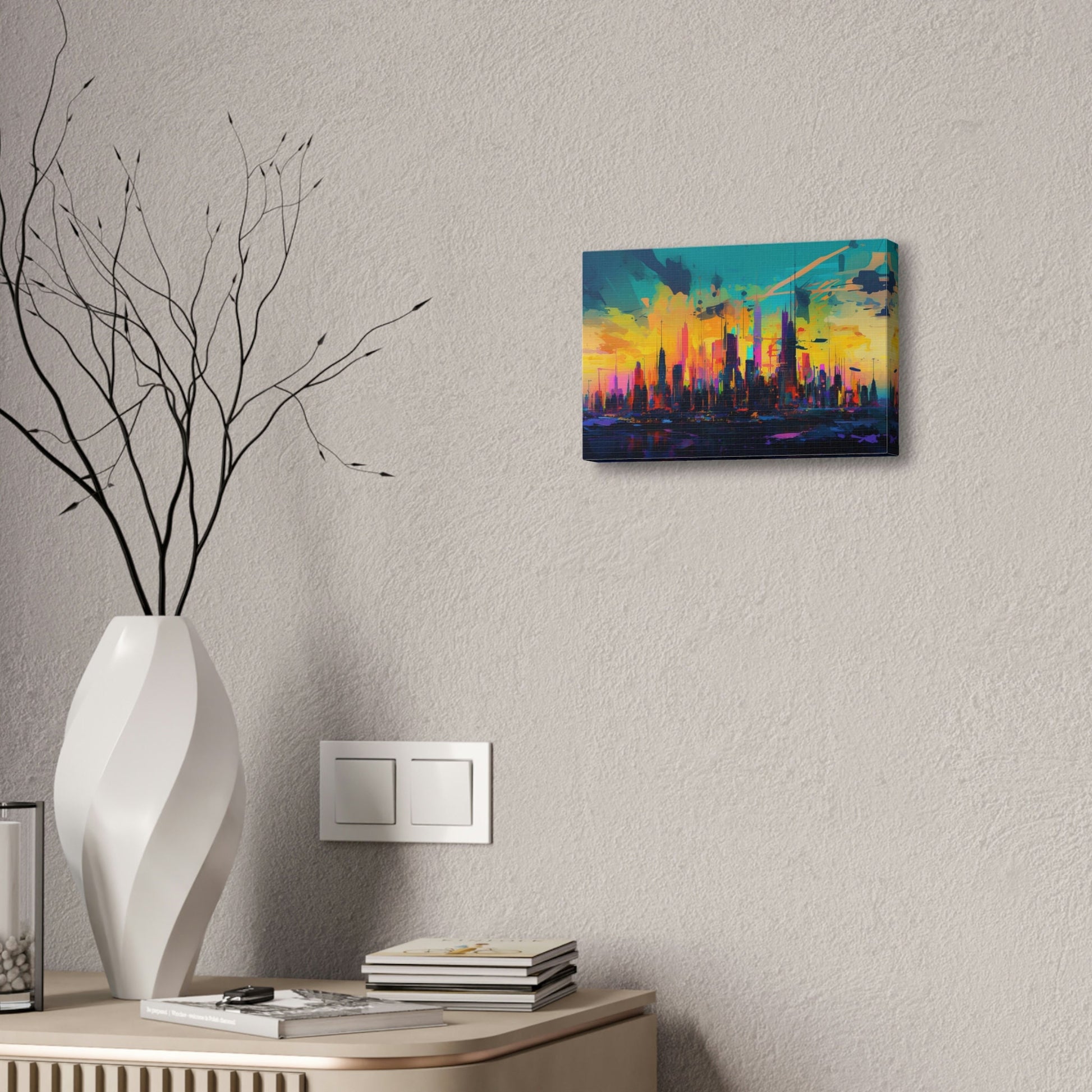 City skyline with a backdrop of bright neon colors exploding from a sunset. This impressionist style Ai Wall Art print makes an impact.