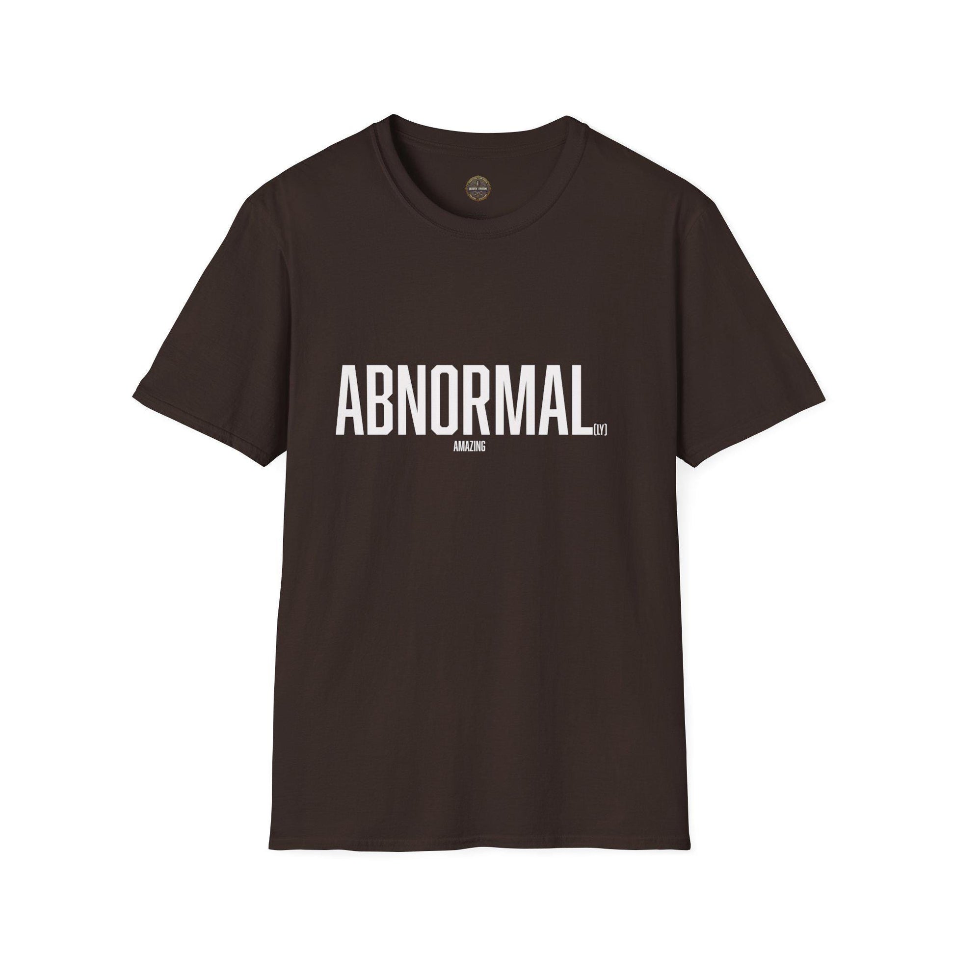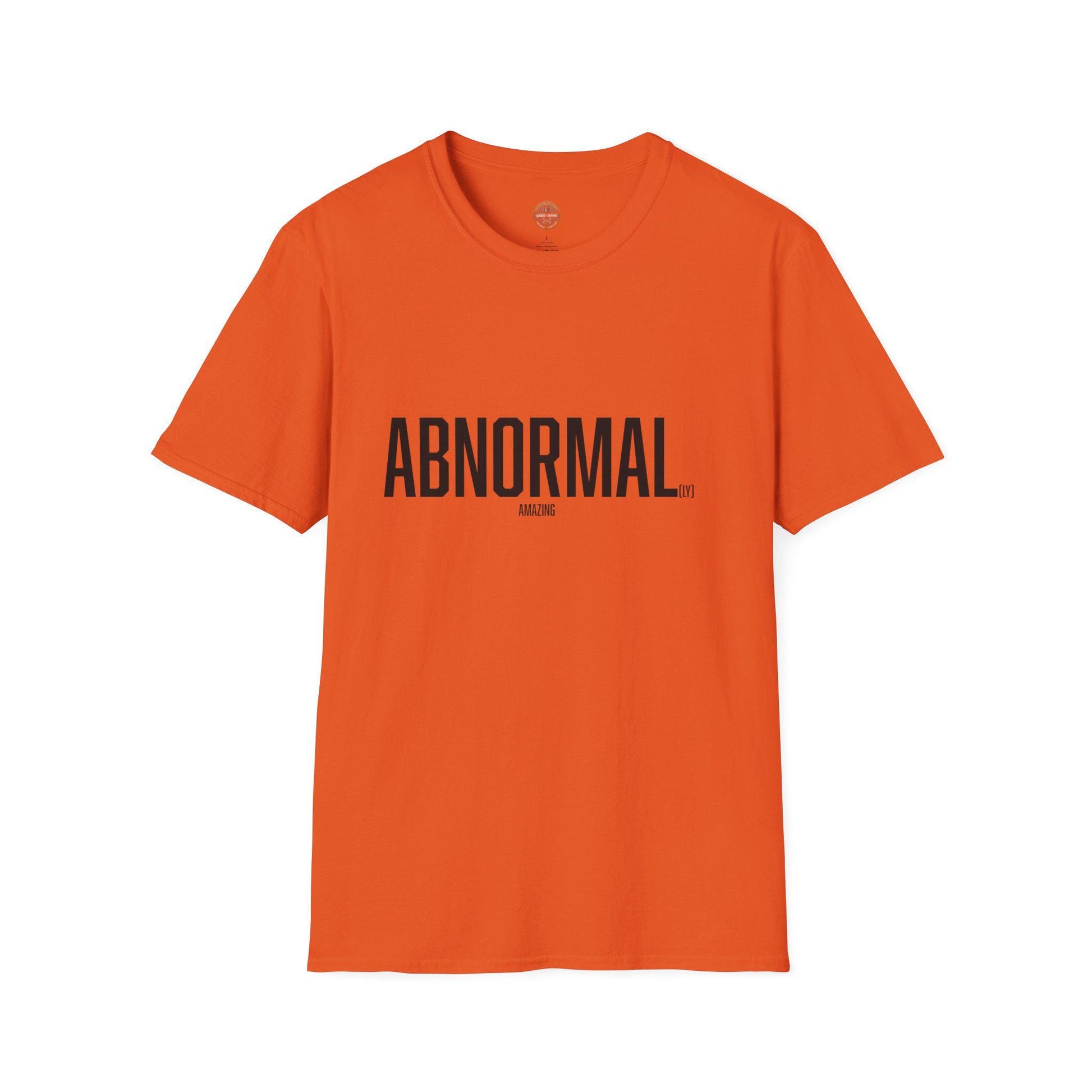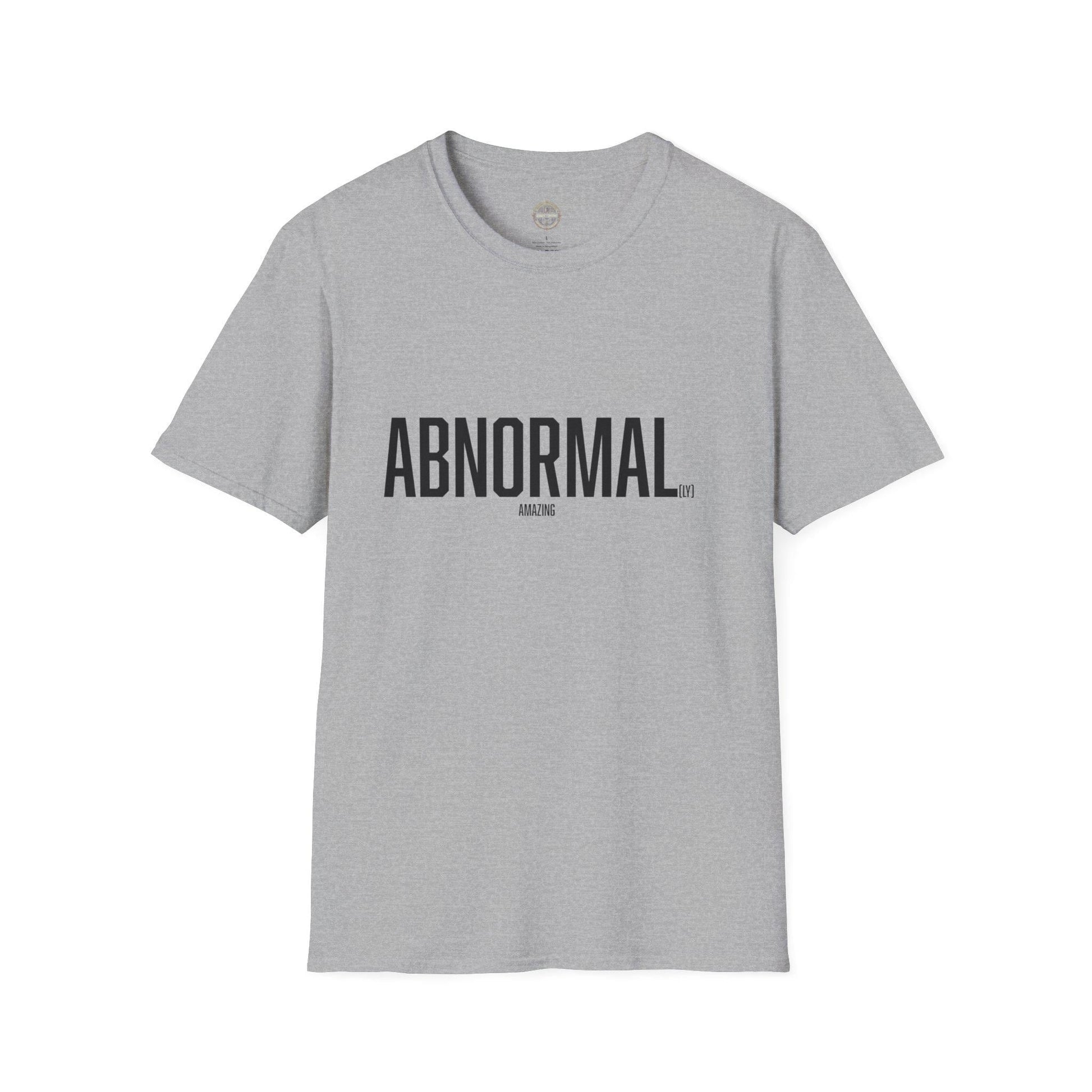A funny T-shirt that looks like it says "abnormal" from far away but actually has "abnormally amazing" printed on it when you get closer. This shirt is perfect for those who appreciate quirky designs and want to add a touch of humor to their wardrobe. Ideal for casual wear or as a conversation starter during social gatherings. Relevant for occasions like casual Fridays, social events, or everyday wear.
