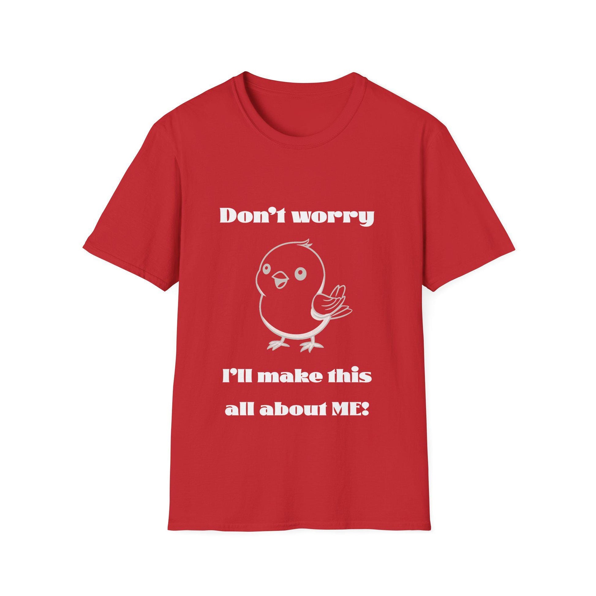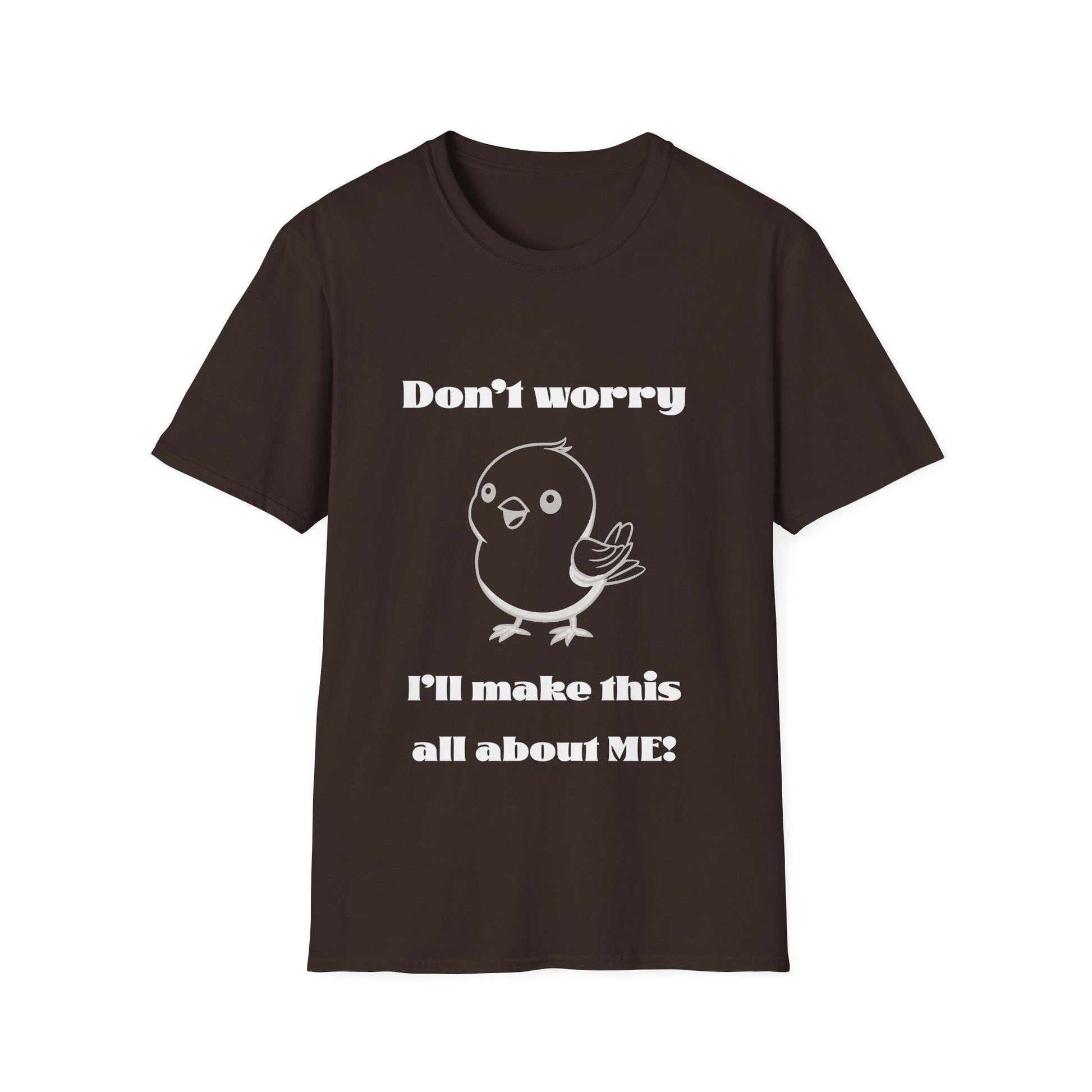 This T-Shirt features a cute little cartoon bird saying, 'don't worry, I'll make this all about me.' It gives off a fun and whimsical vibe, perfect for those who love quirky and light-hearted designs. This T-Shirt is great for casual wear and can bring a smile to anyone's face. It is ideal for bird lovers and those who enjoy playful graphic tees. Perfect for birthdays, casual outings, or just lounging at home.