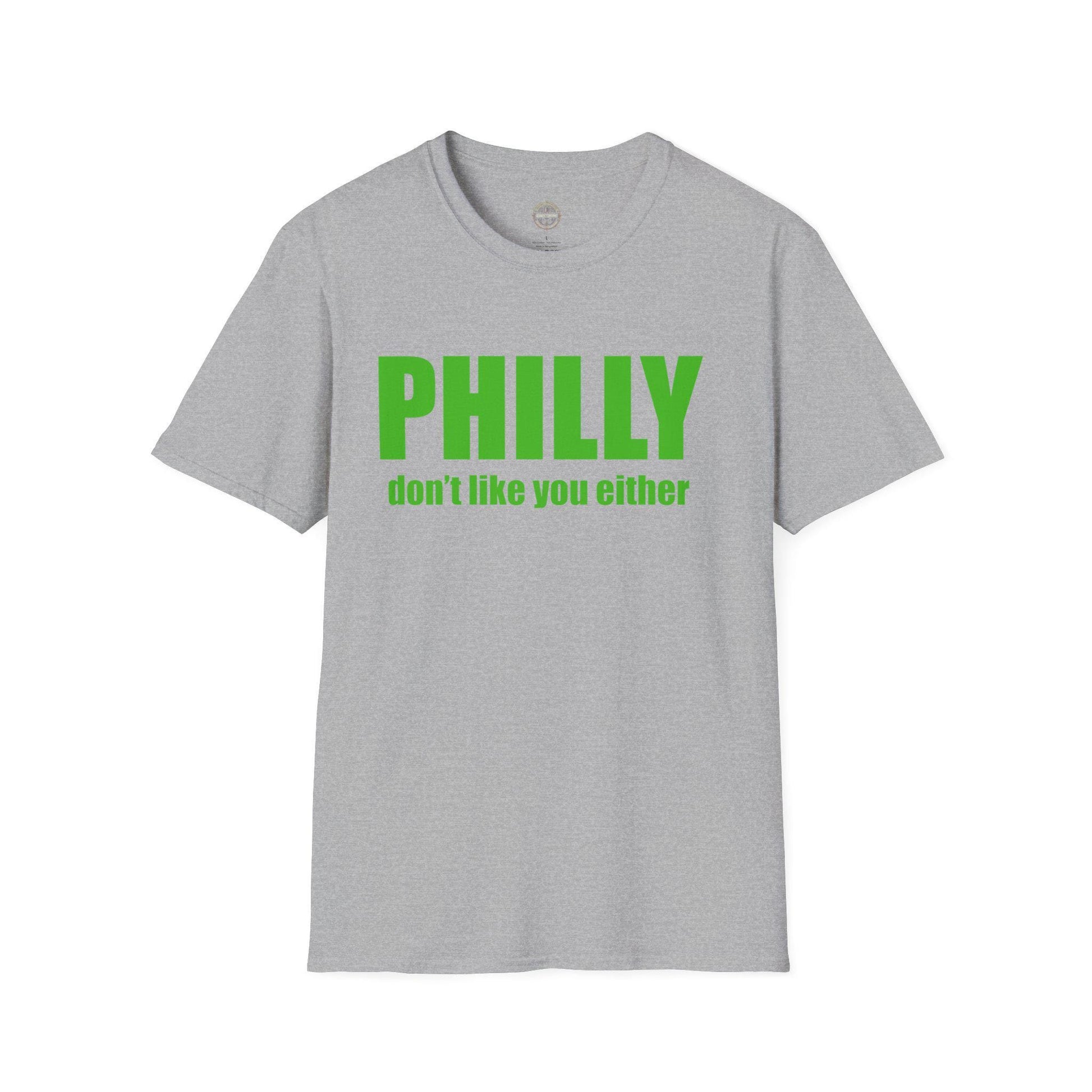 A funny sports T-shirt with the phrase "Philly don't like you either" printed on it. This softstyle unisex T-shirt is made from durable and smooth fabric, perfect for printing. It offers a versatile style that can match any occasion, giving off a casual and playful vibe. Ideal for sports fans and those with a sense of humor, this T-shirt is perfect for casual outings, sports events, and everyday wear.