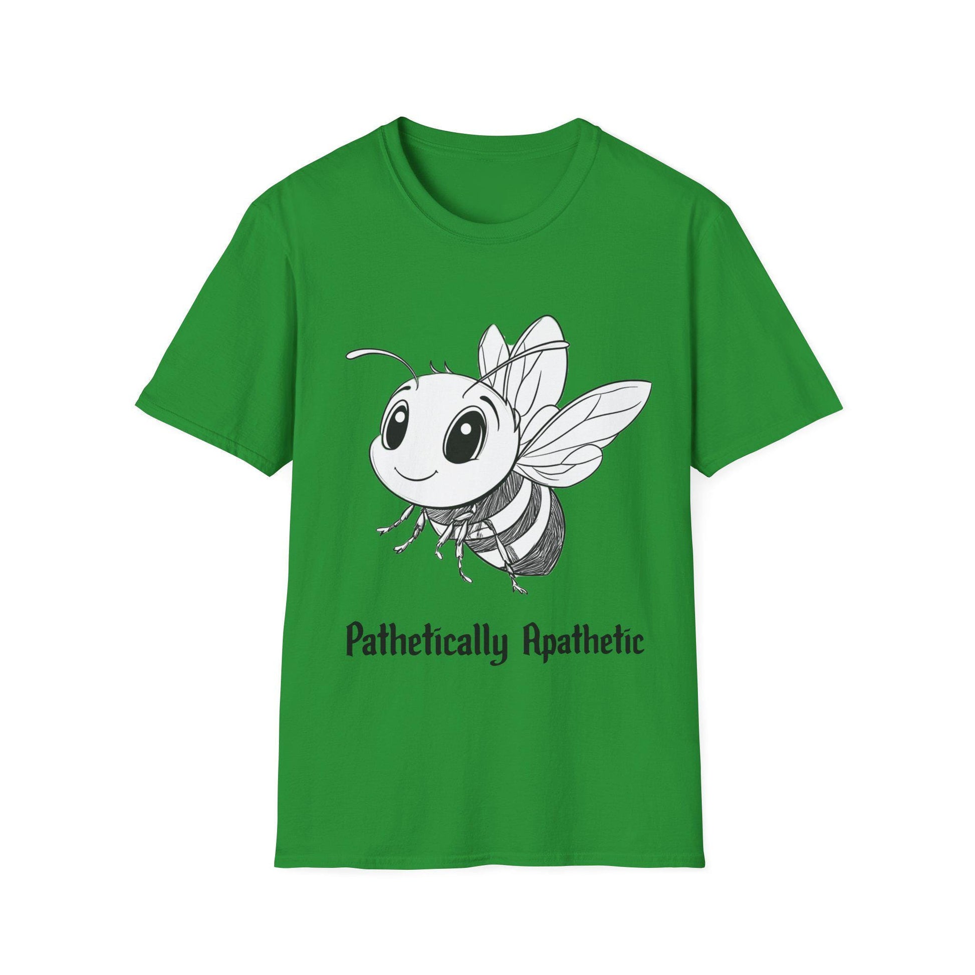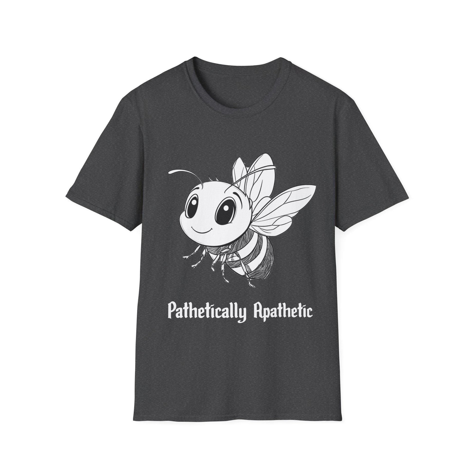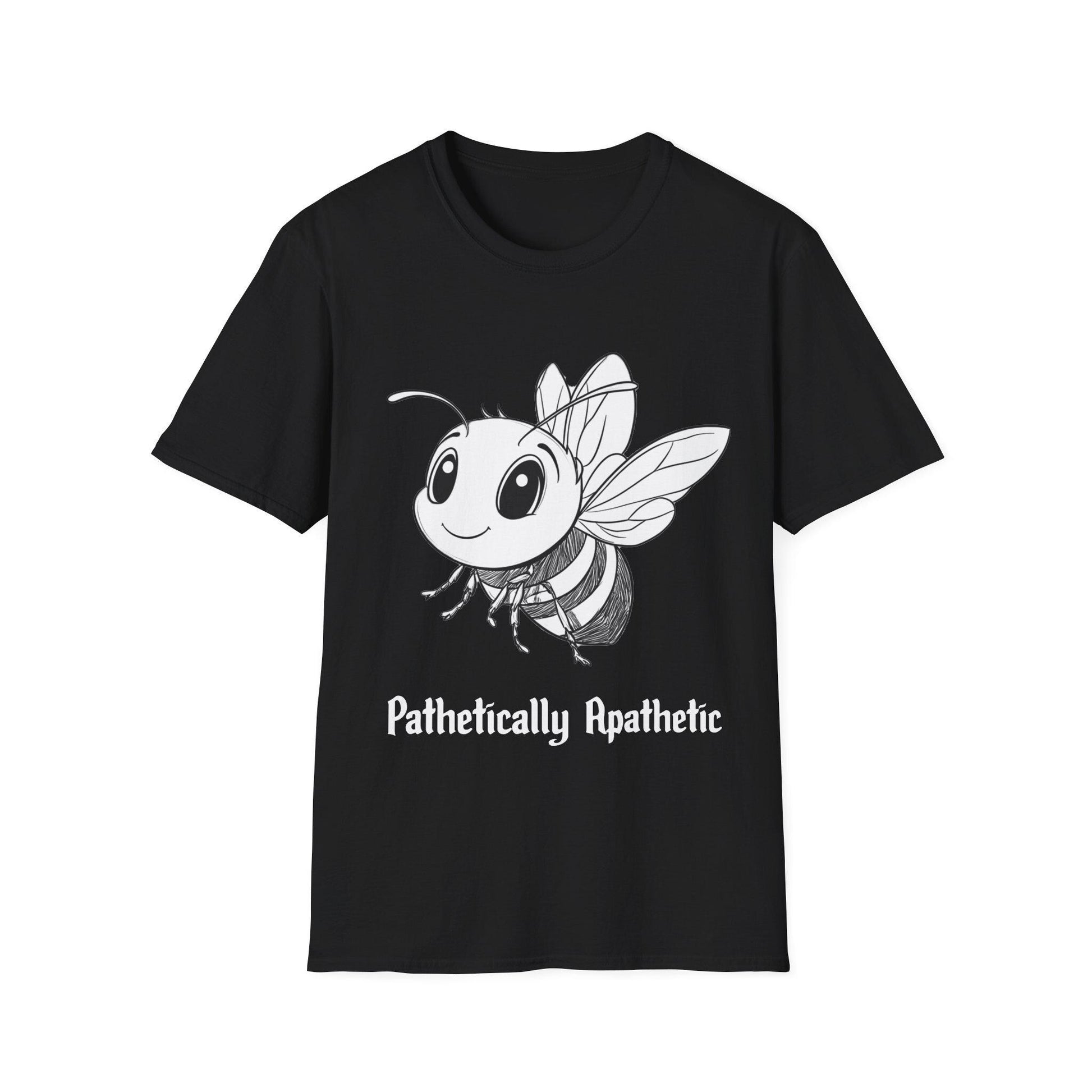 A cheerful T-shirt featuring a cartoon bee with a witty saying, 'pathetically apathetic'. This fun design exudes a lighthearted and carefree vibe, perfect for those who appreciate quirky humor. Ideal for casual wear and can be a great conversation starter for social gatherings. Suitable for adults and can be worn year-round.