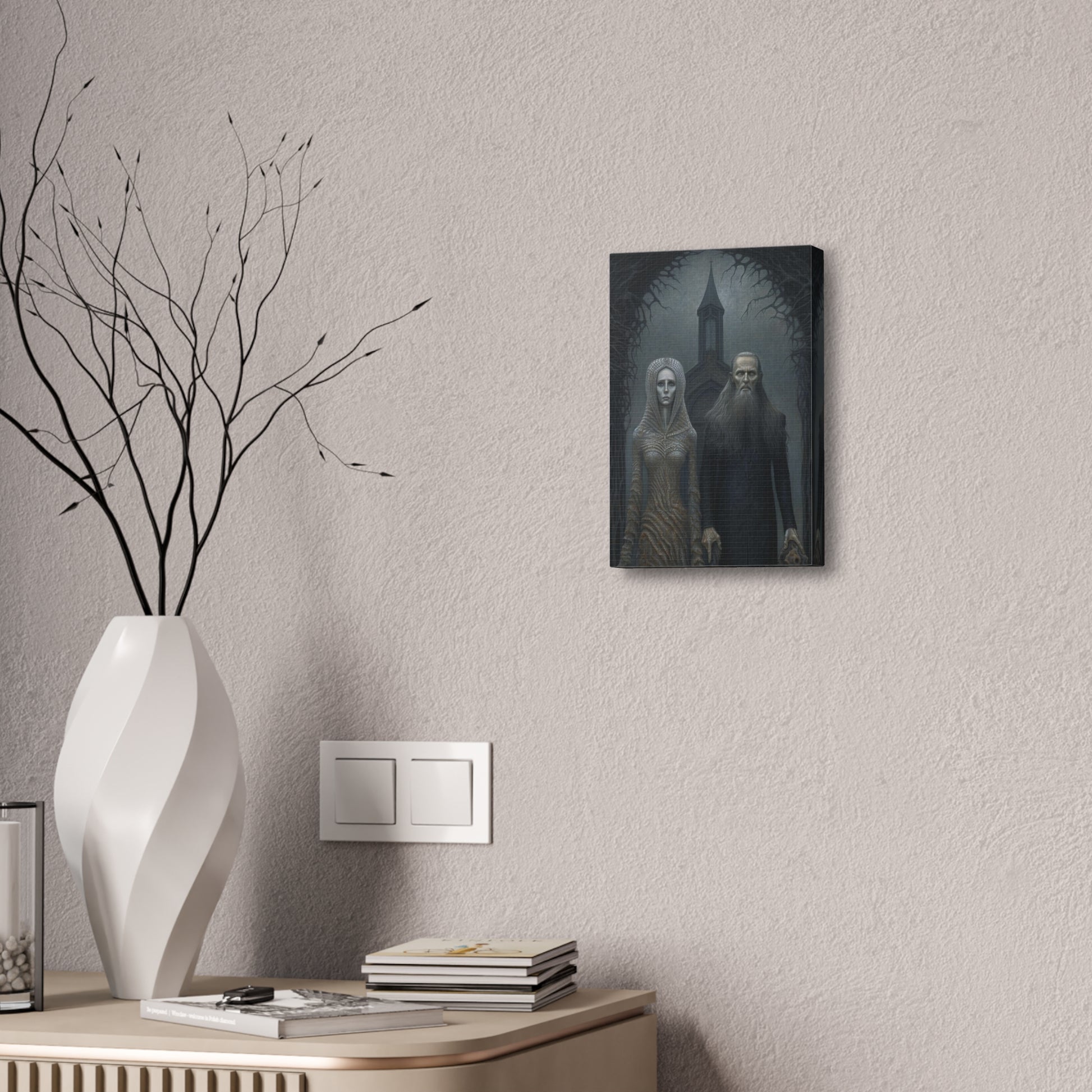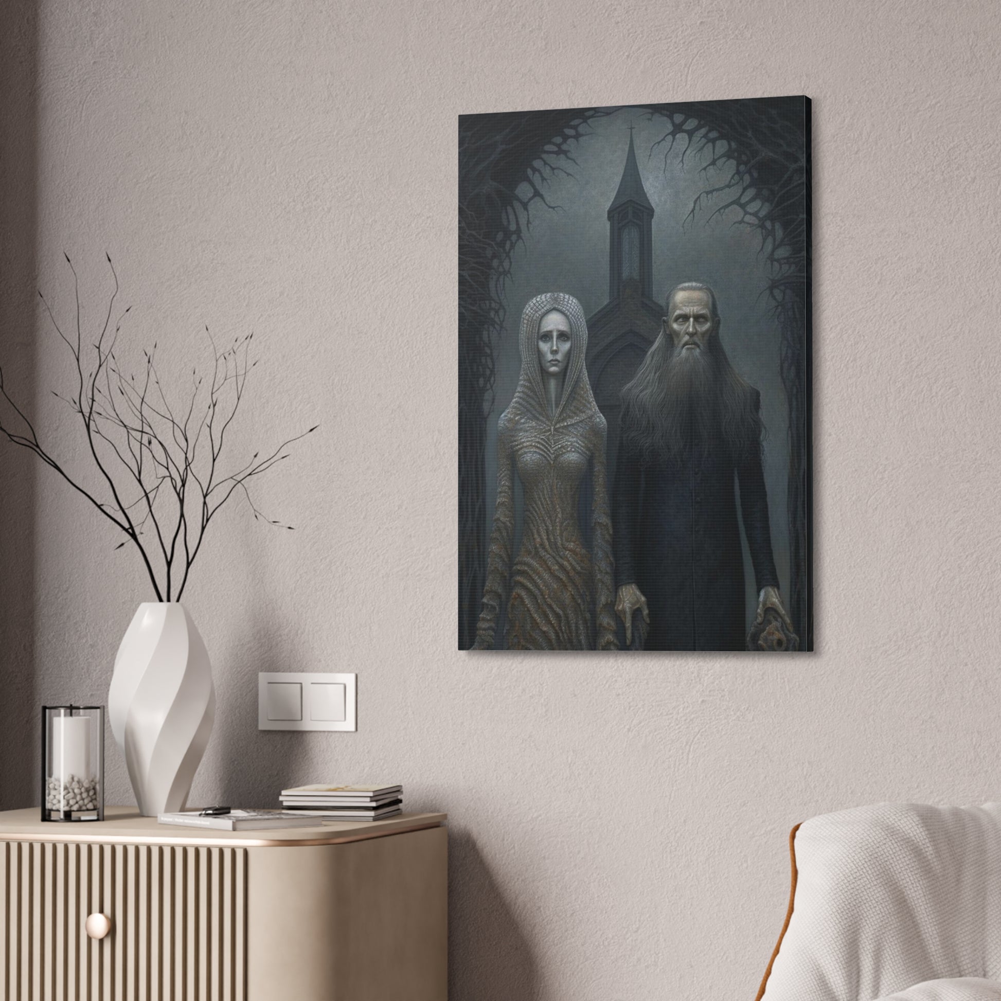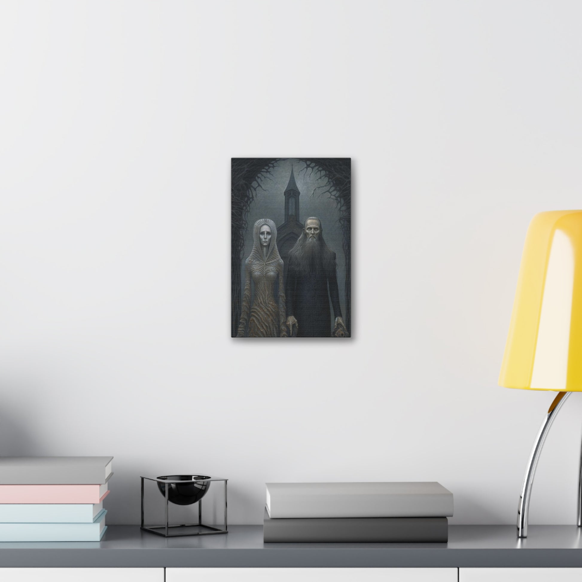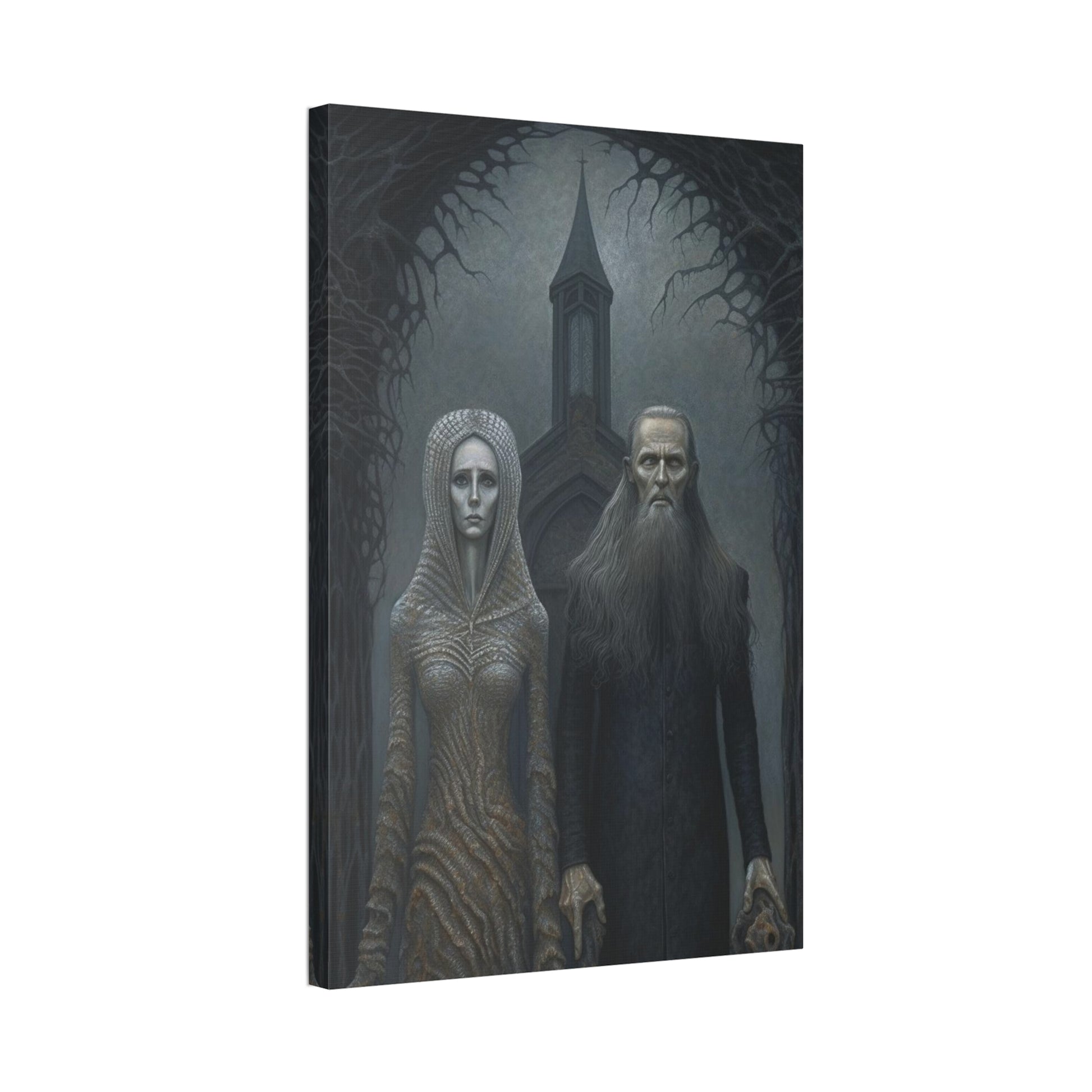 Gothic American Gothic: AI generated version of the classic masterpiece through the eyes of artists known for haunting surreal paintings.