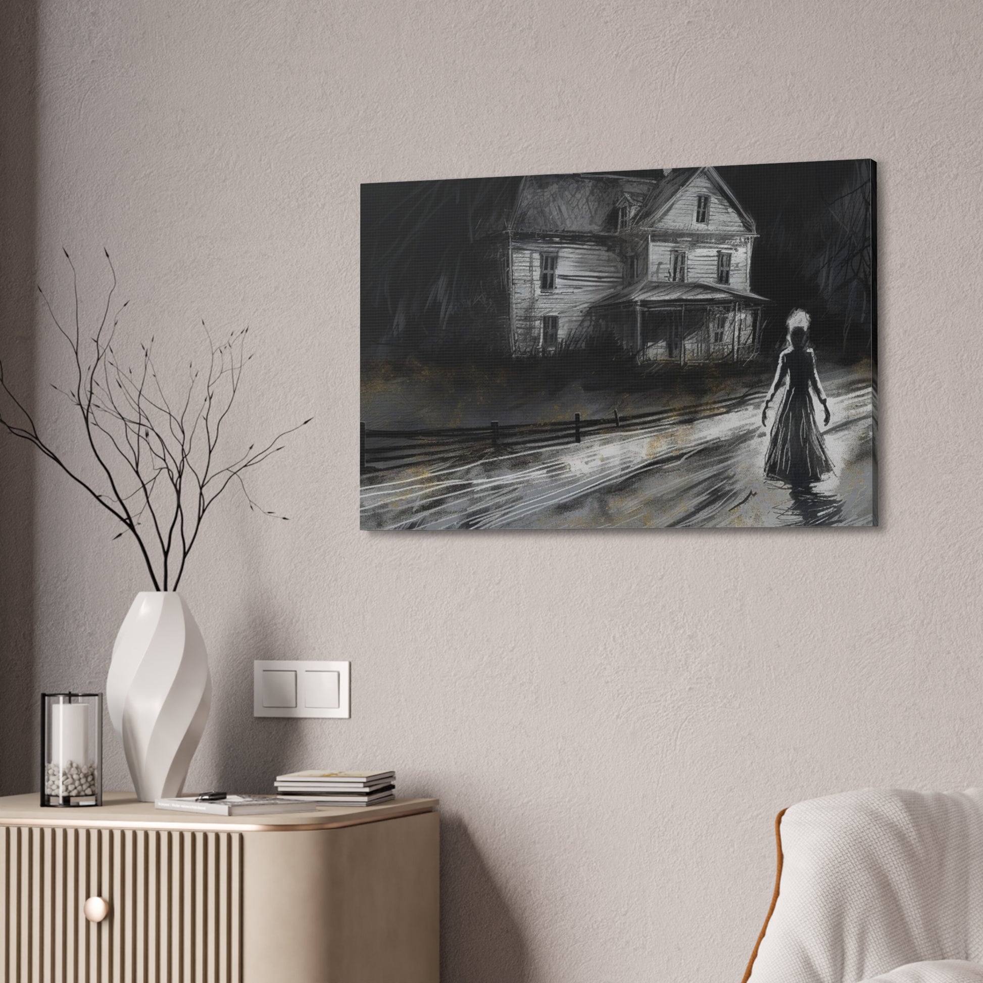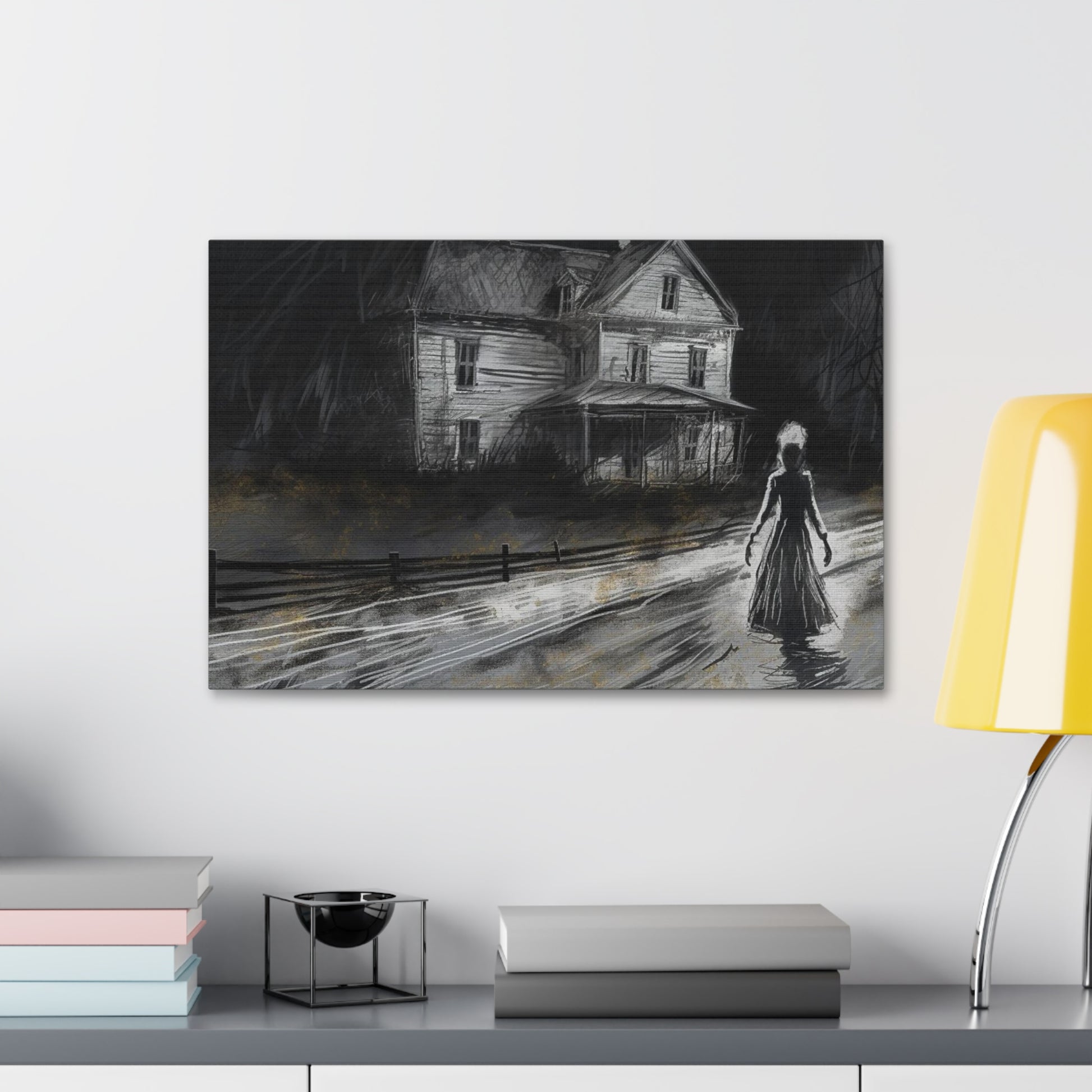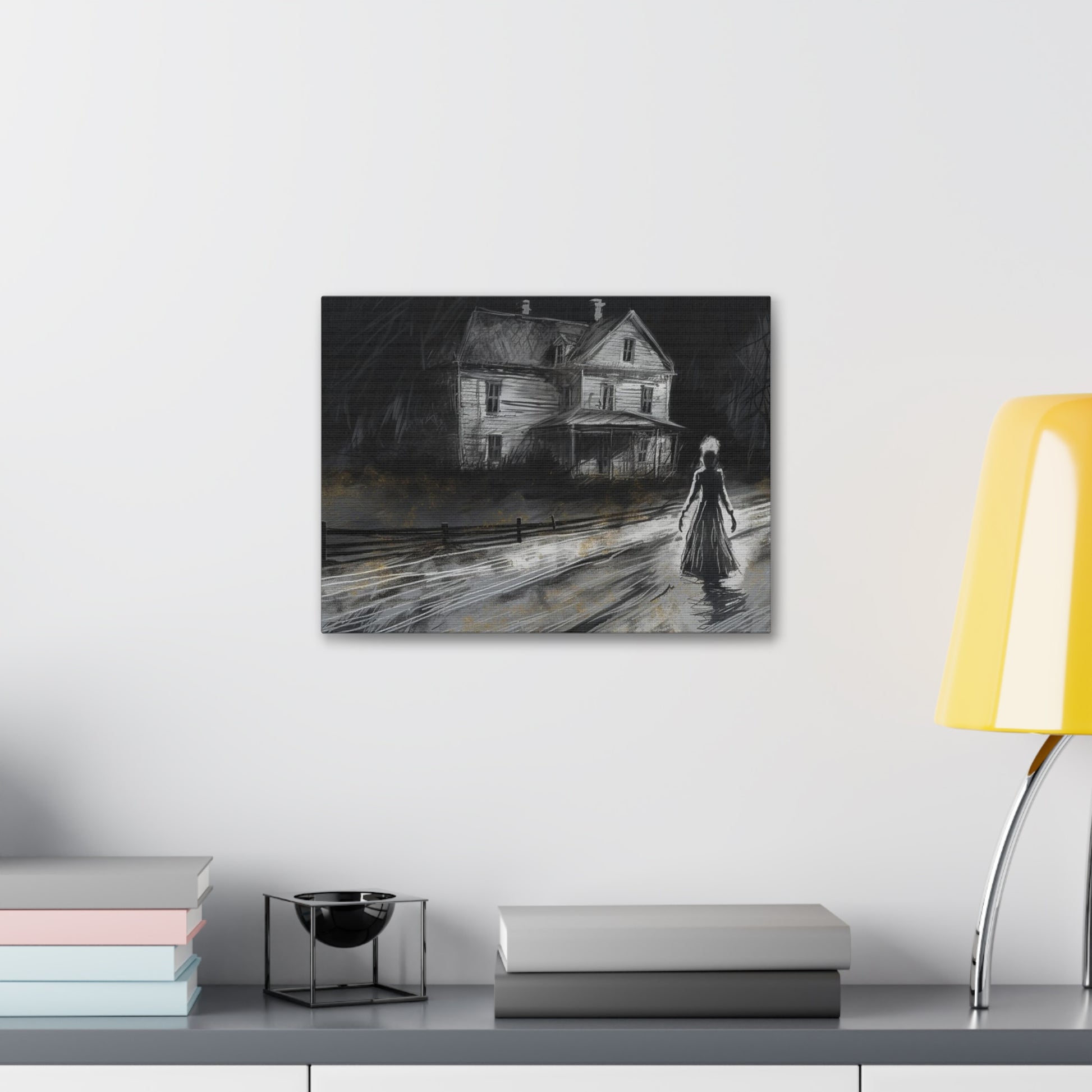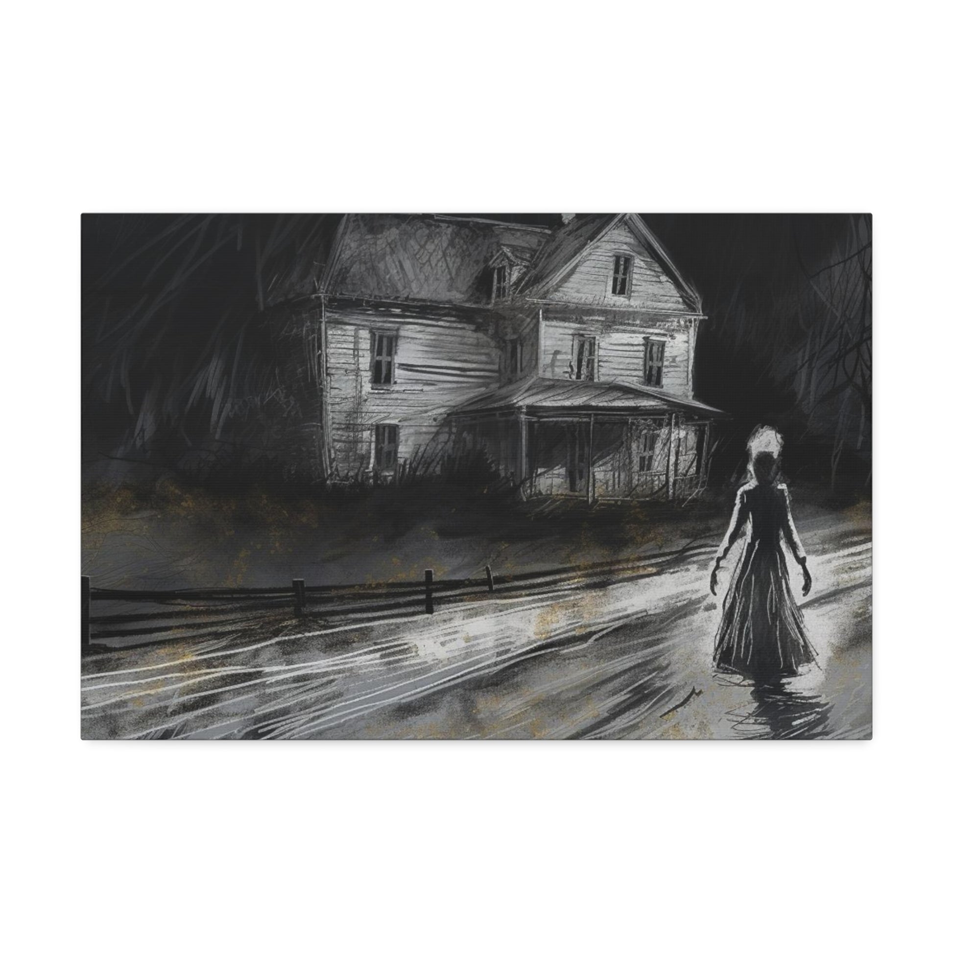Haunting Charcoal and Pastel Sketch of a slender dark woman on a lonely path by an ominous house: AI generated ominous wall art.