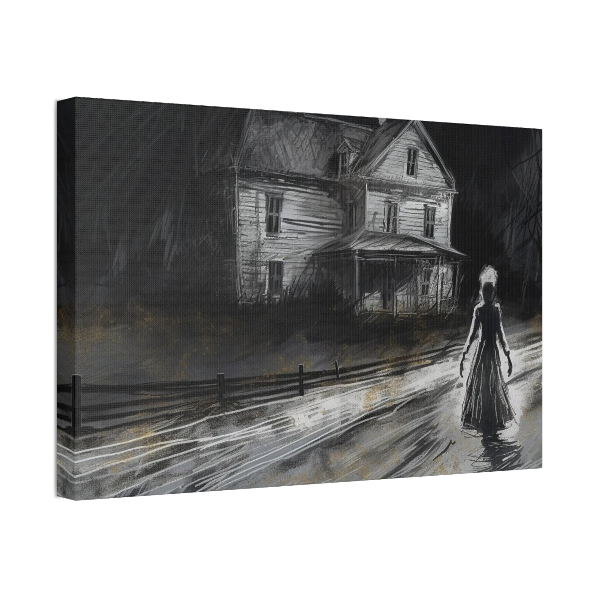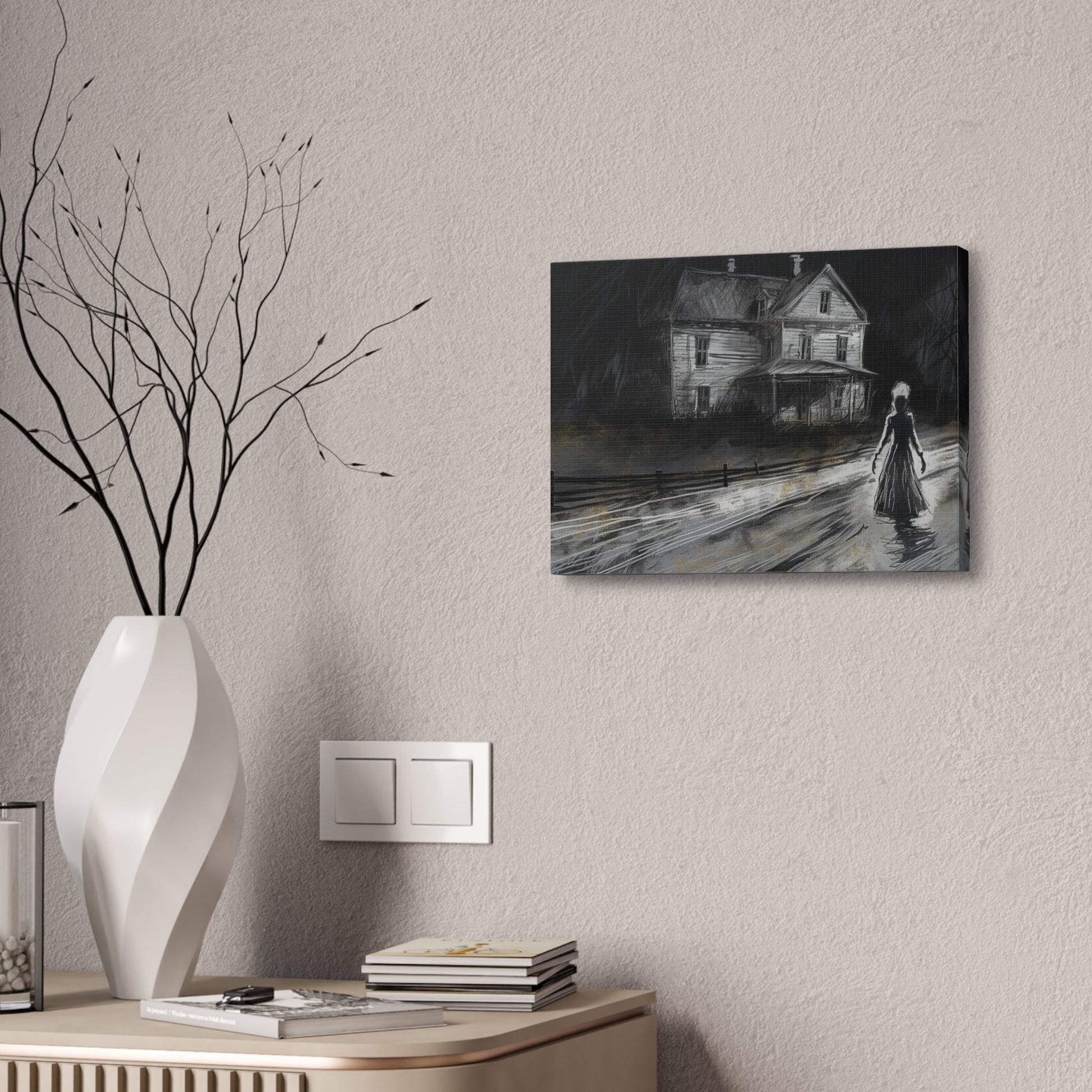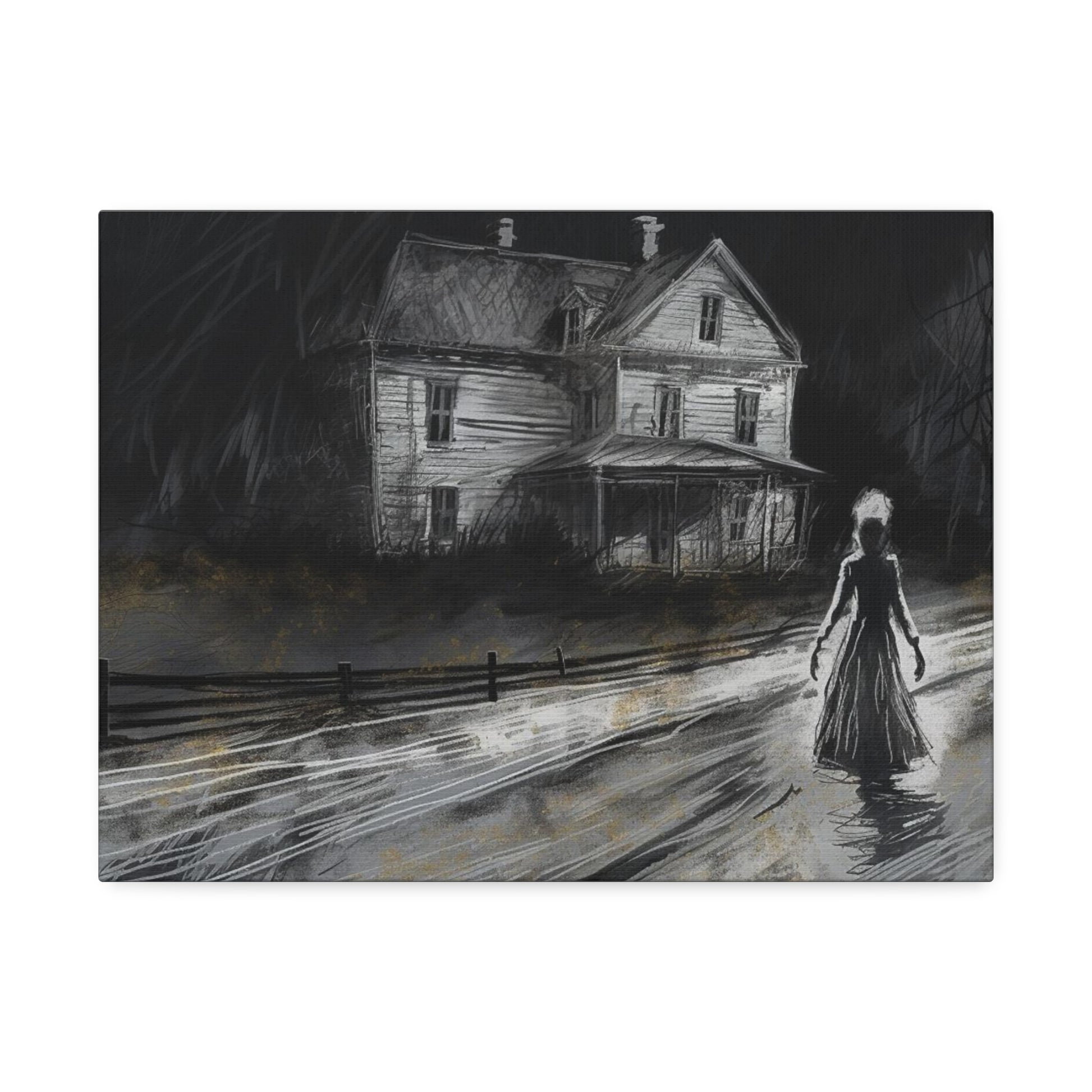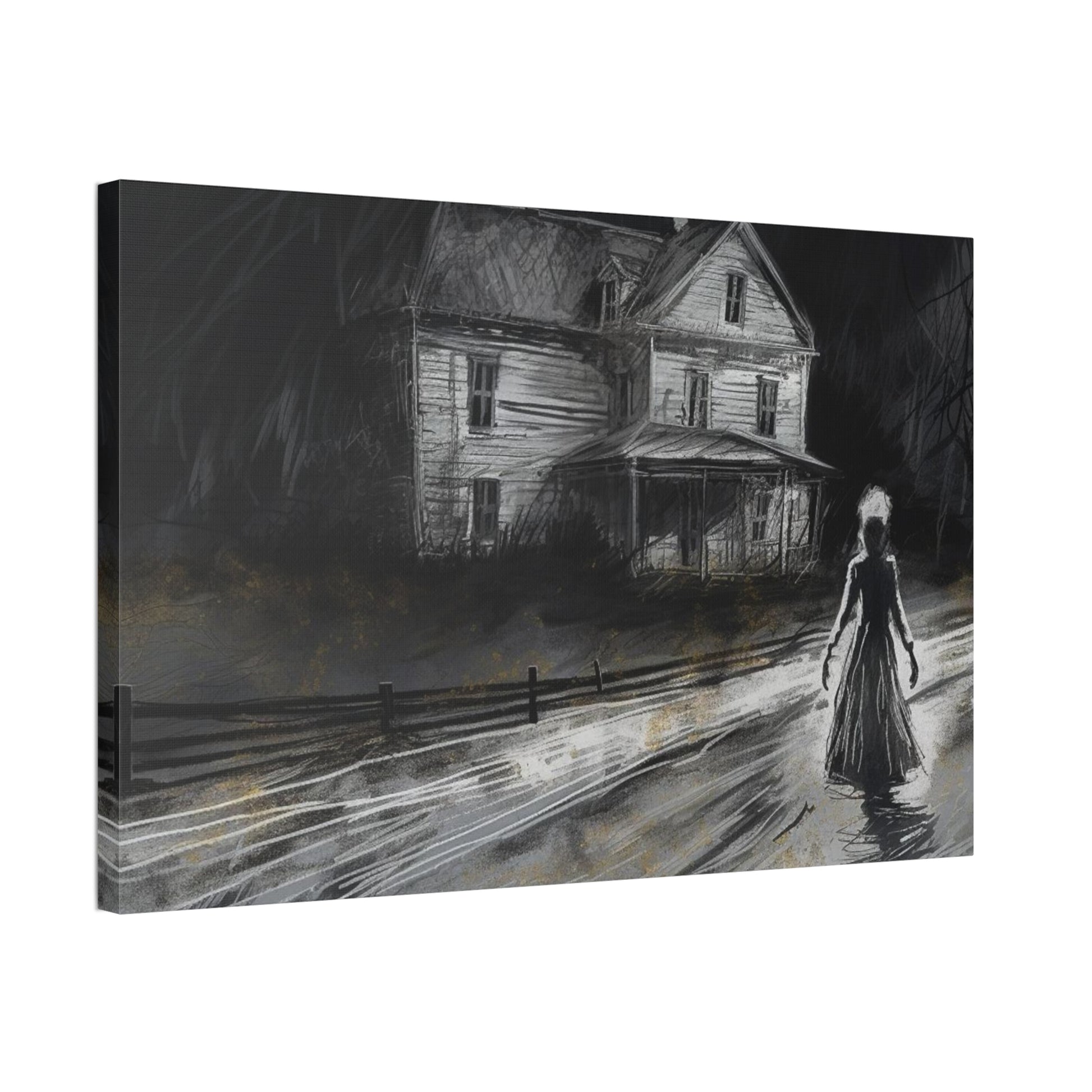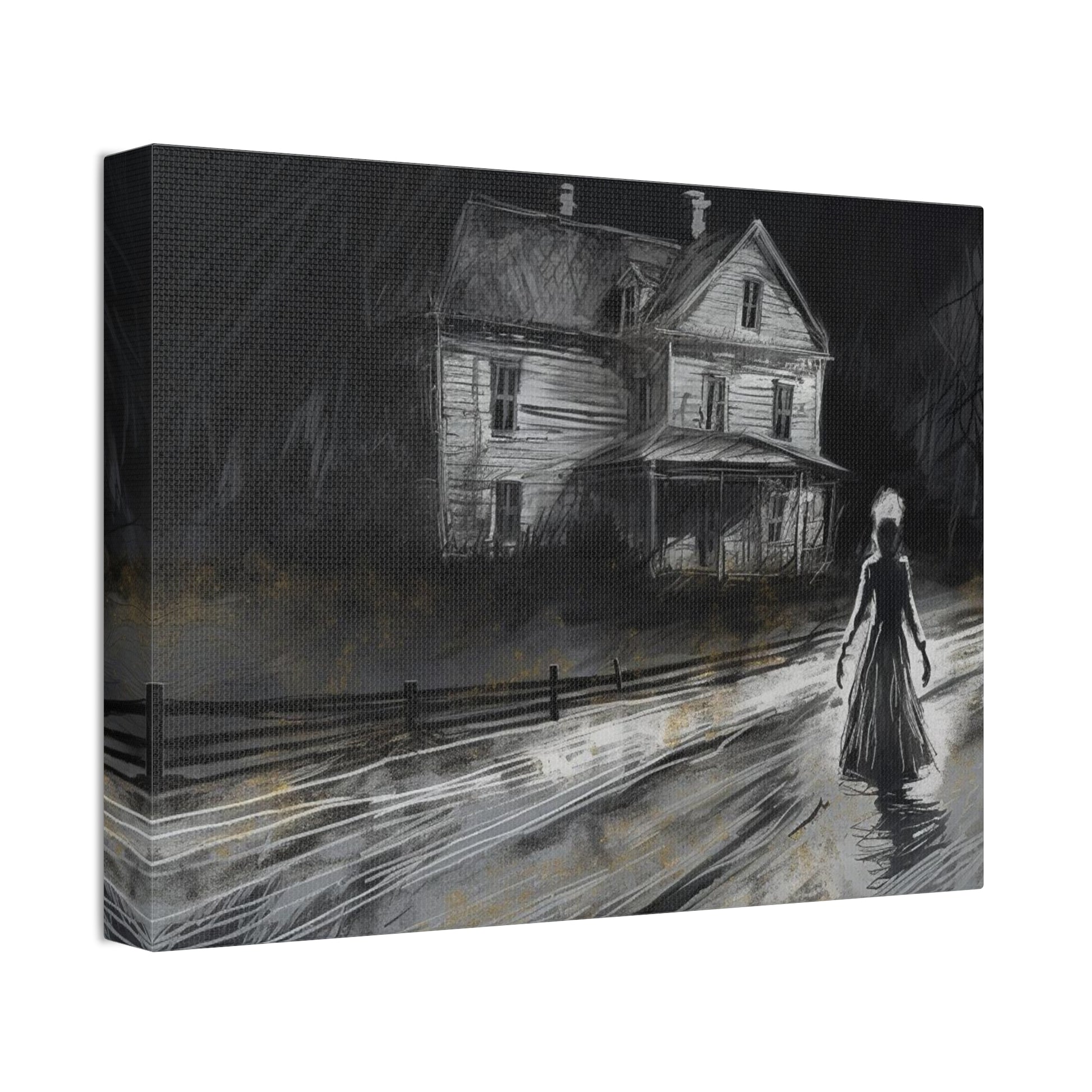 Haunting Charcoal and Pastel Sketch of a slender dark woman on a lonely path by an ominous house: AI generated ominous wall art.