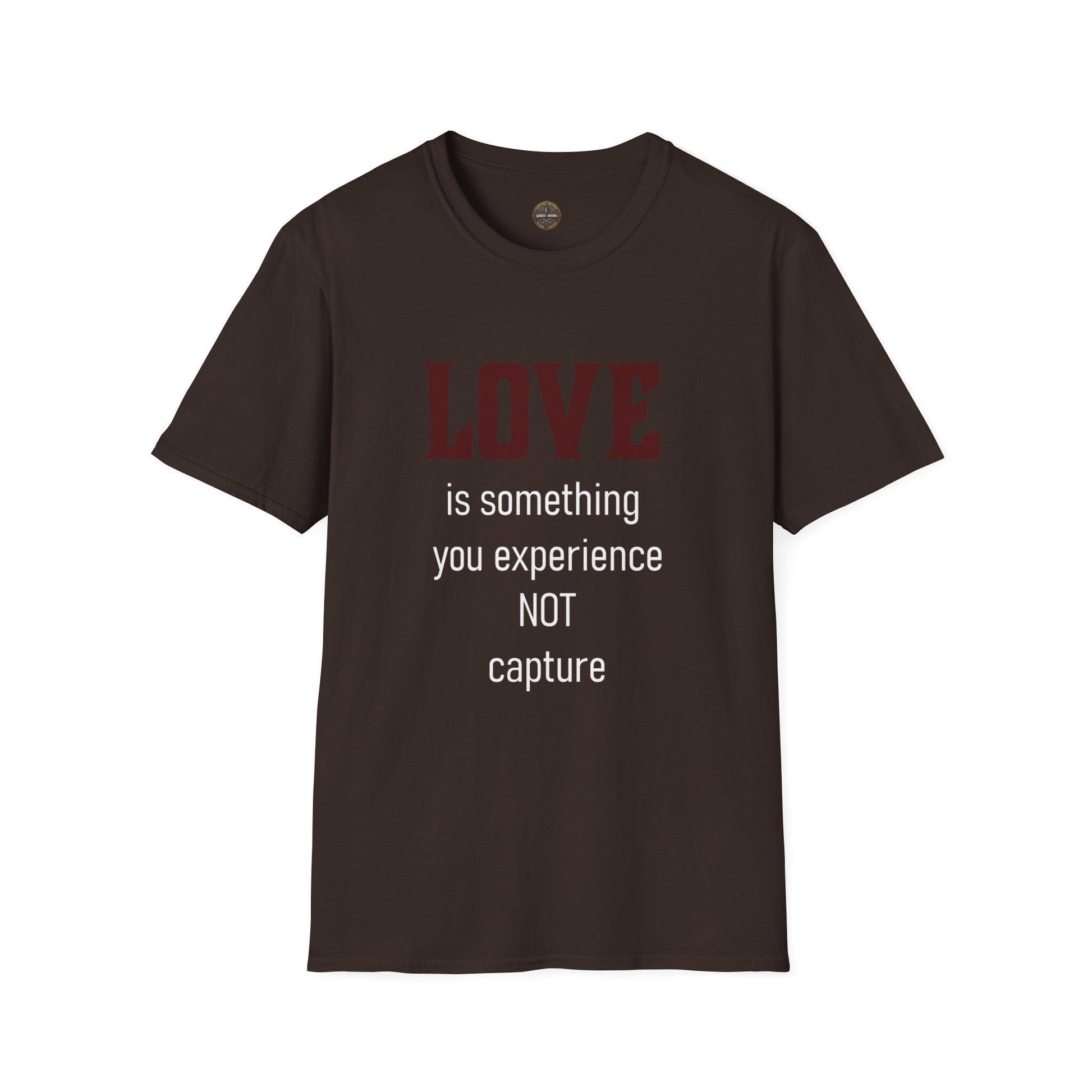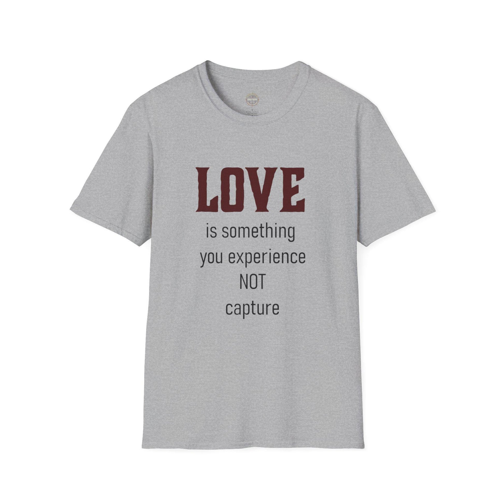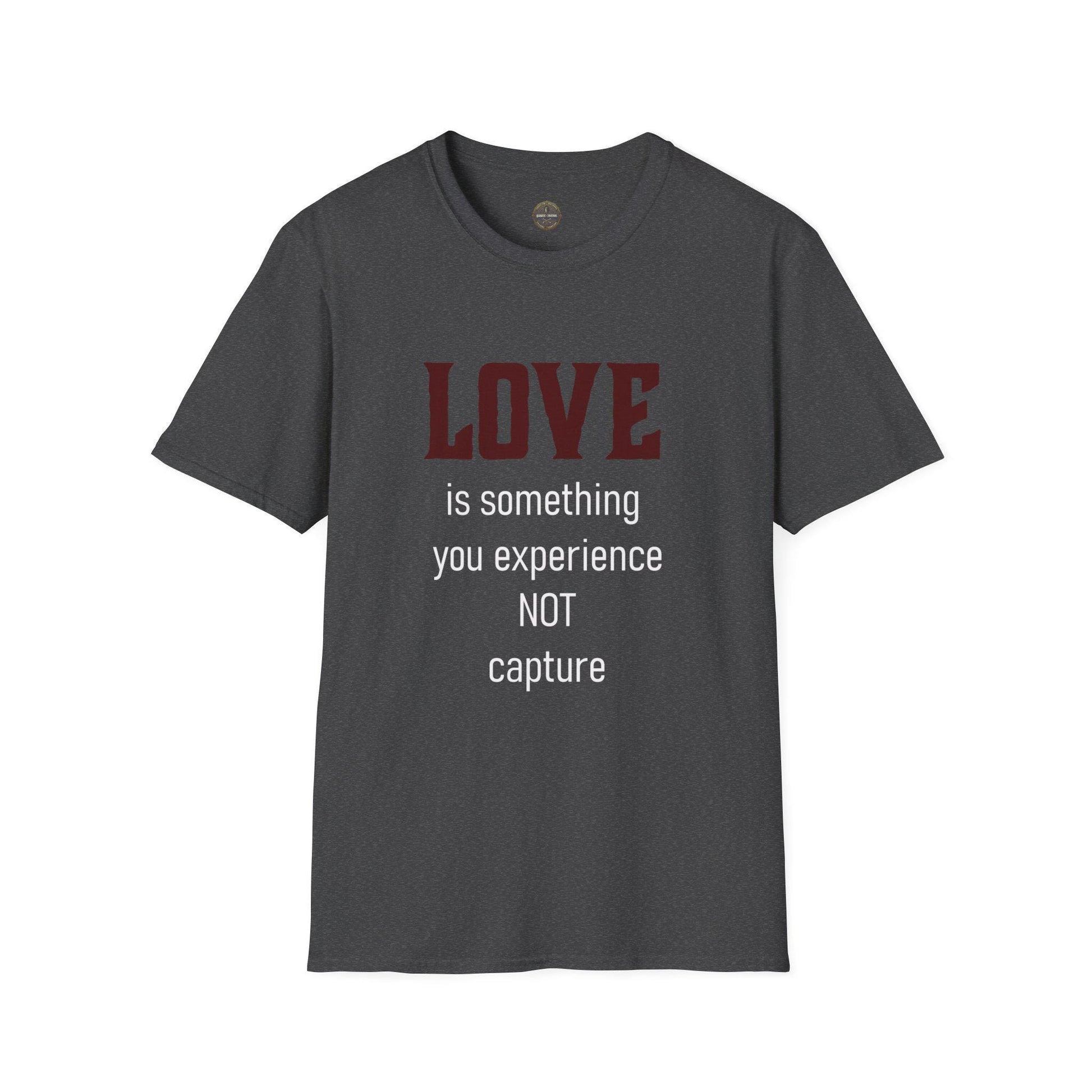 A unisex softstyle t-shirt featuring a quote 'love is something you experience, not capture'. This t-shirt is made from durable and smooth fabric, perfect for printing. It is suitable for adults and comes with a 2-year EU warranty. The classic fit and crew neckline offer a versatile style for any occasion.
