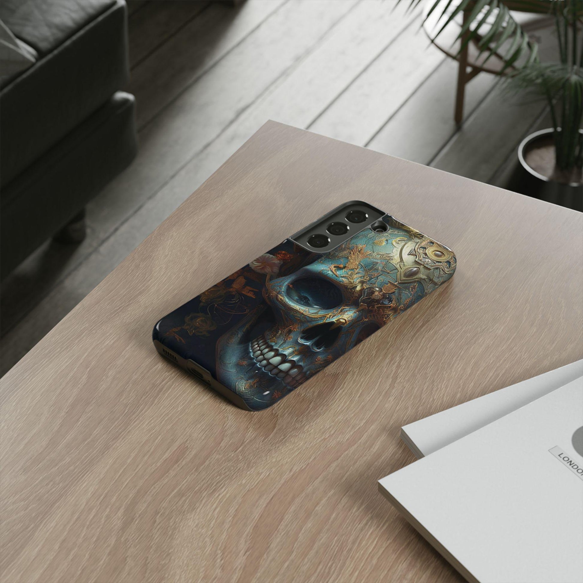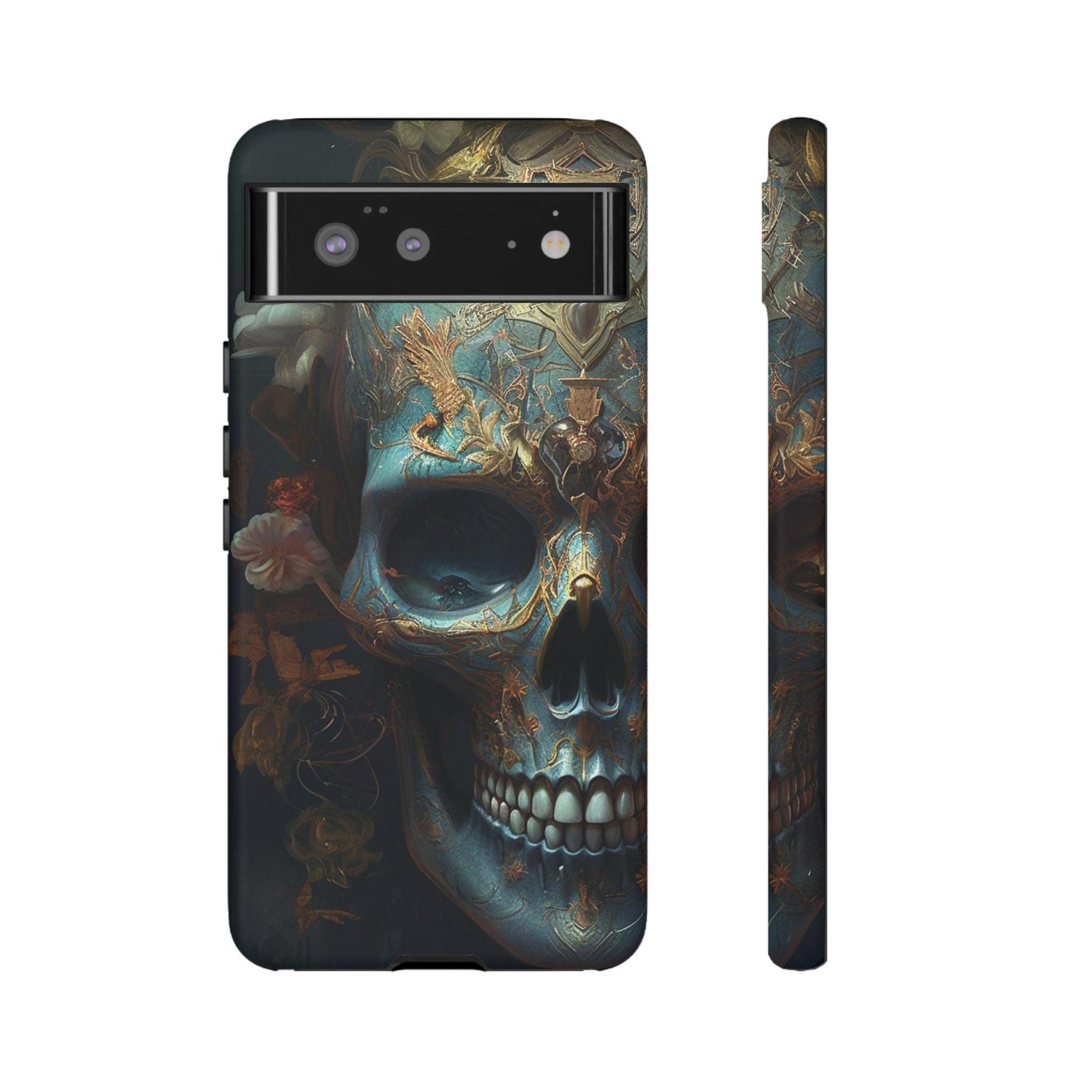 Ornate Decorated Sky Blue Skull Samsung Galaxy, and Google Pixel devices with premium-quality custom protective phone cases. Every case has double layers for extra durability and protection. The outer polycarbonate shell will resist daily impacts. Create a beautiful design, and we'll print it in picture-perfect quality with a glossy or matte finish.