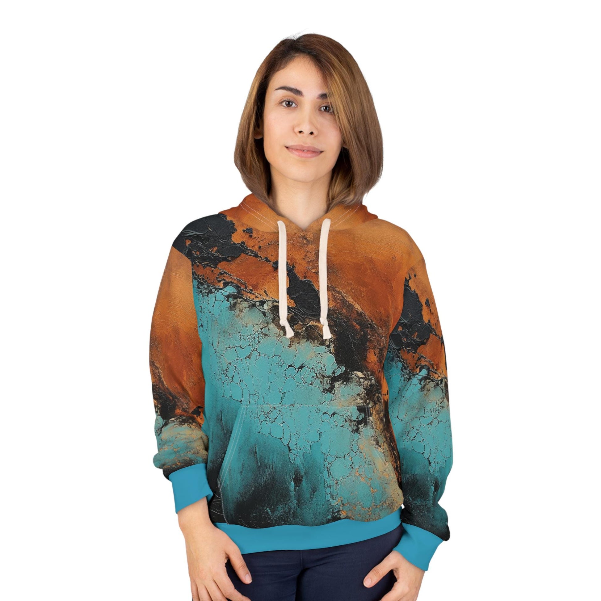 Rust Teal Black Orange Abstract Art Hoodie with bright and intense colors, spacious pocket, adjustable hood, and made of 100% polyester. Perfect for those looking for a unique, cool, and trendy hoodie. Ideal as a gift for art lovers.