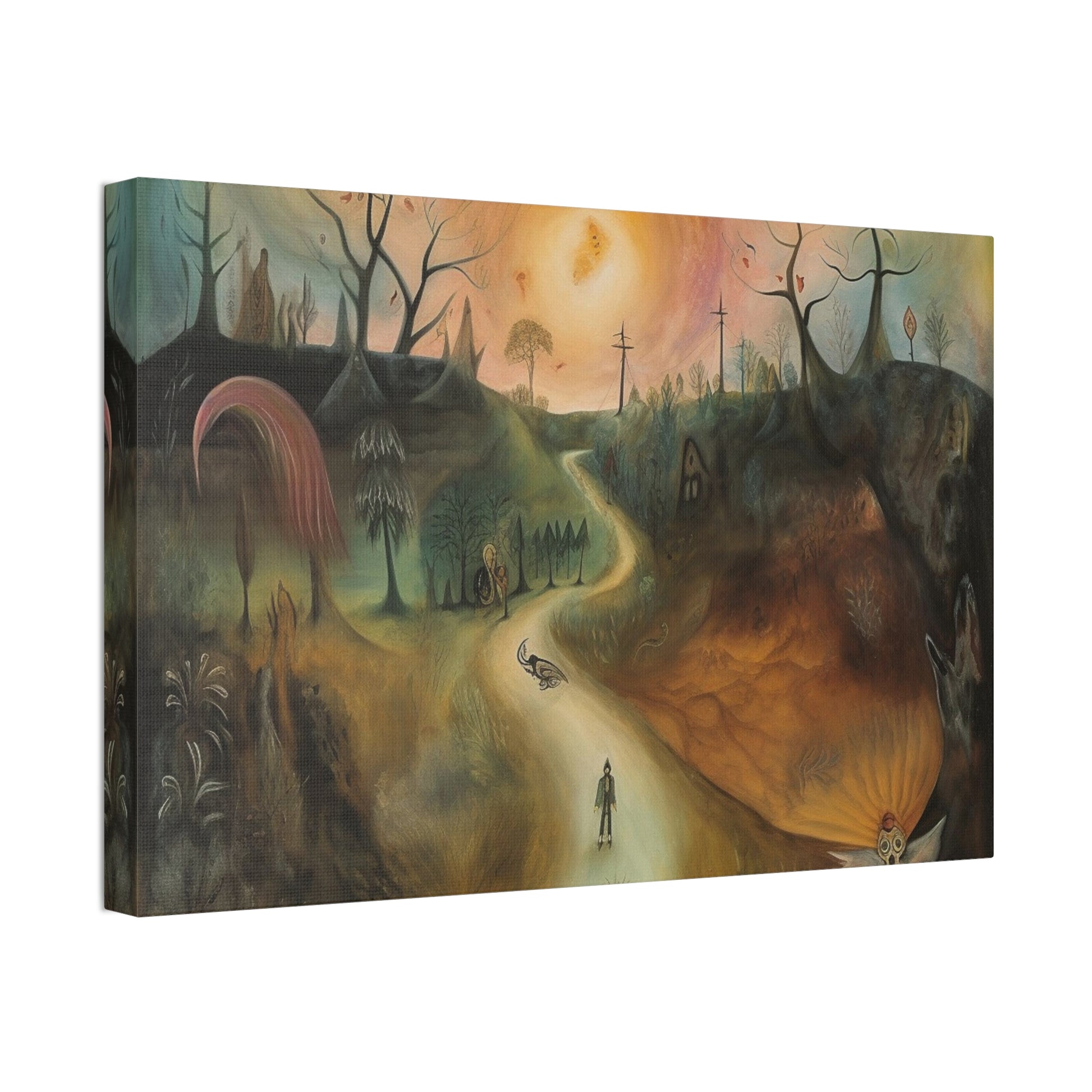 Sleep Paralysis Road: AI generated version of the a Surrealistic piece meant to be haunting and dreamy wall art. Ode to Leonora Carrington.