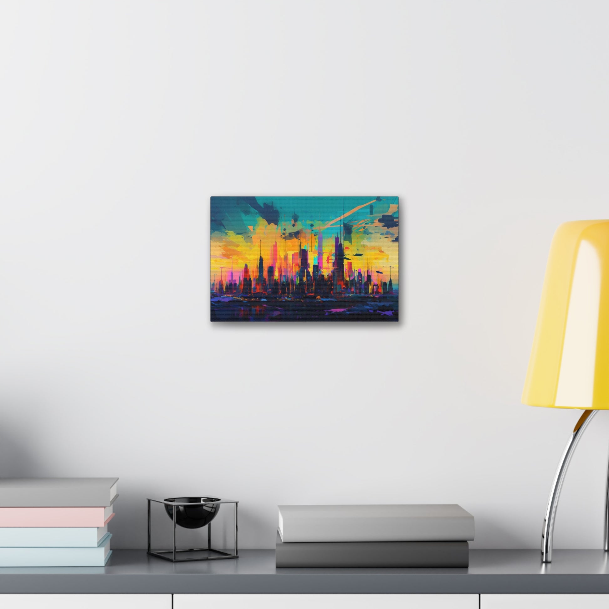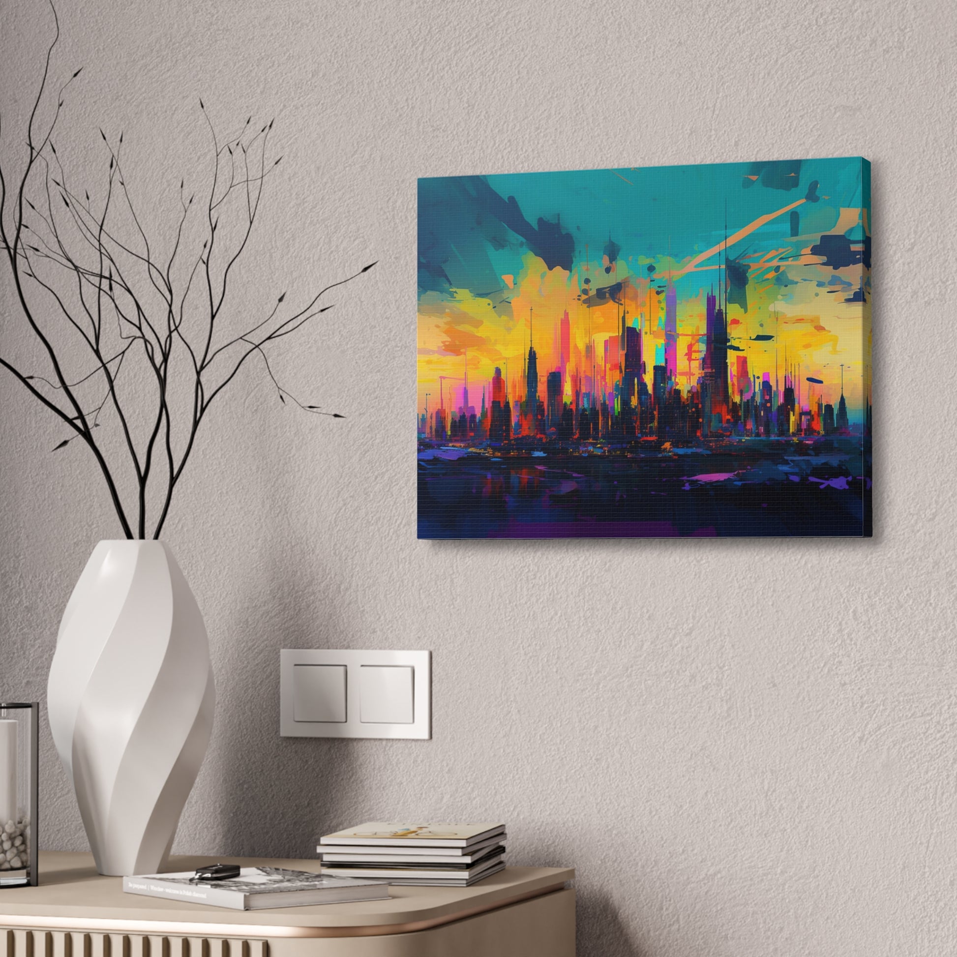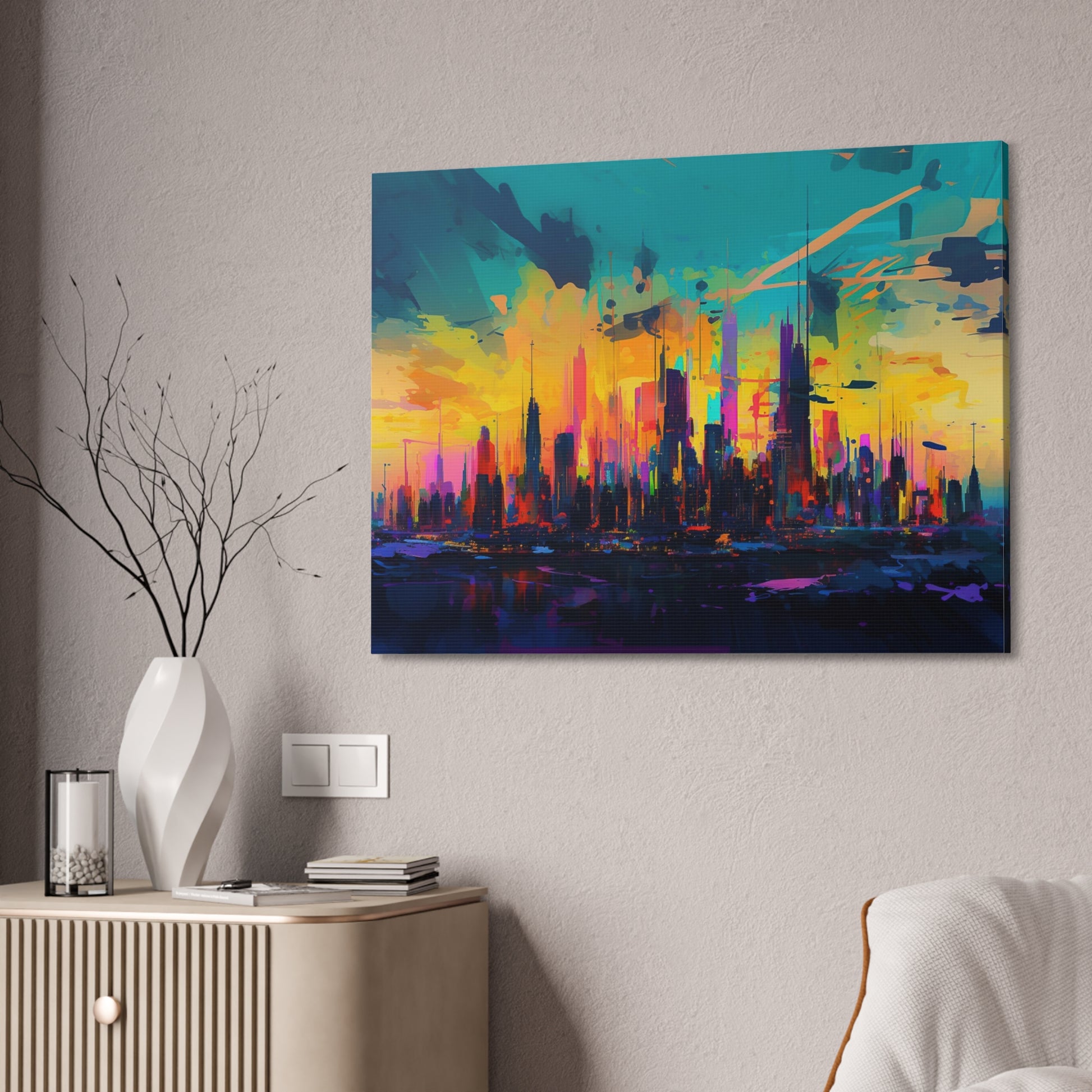 A beautiful depiction of an abstract city skyline exploding with color from the backdrop of a spectacular sunset. The art was created using painstakingly crafted word prompts submitted to AI technology with the intention of developing a breathtaking visual display guaranteed to brighten any room.