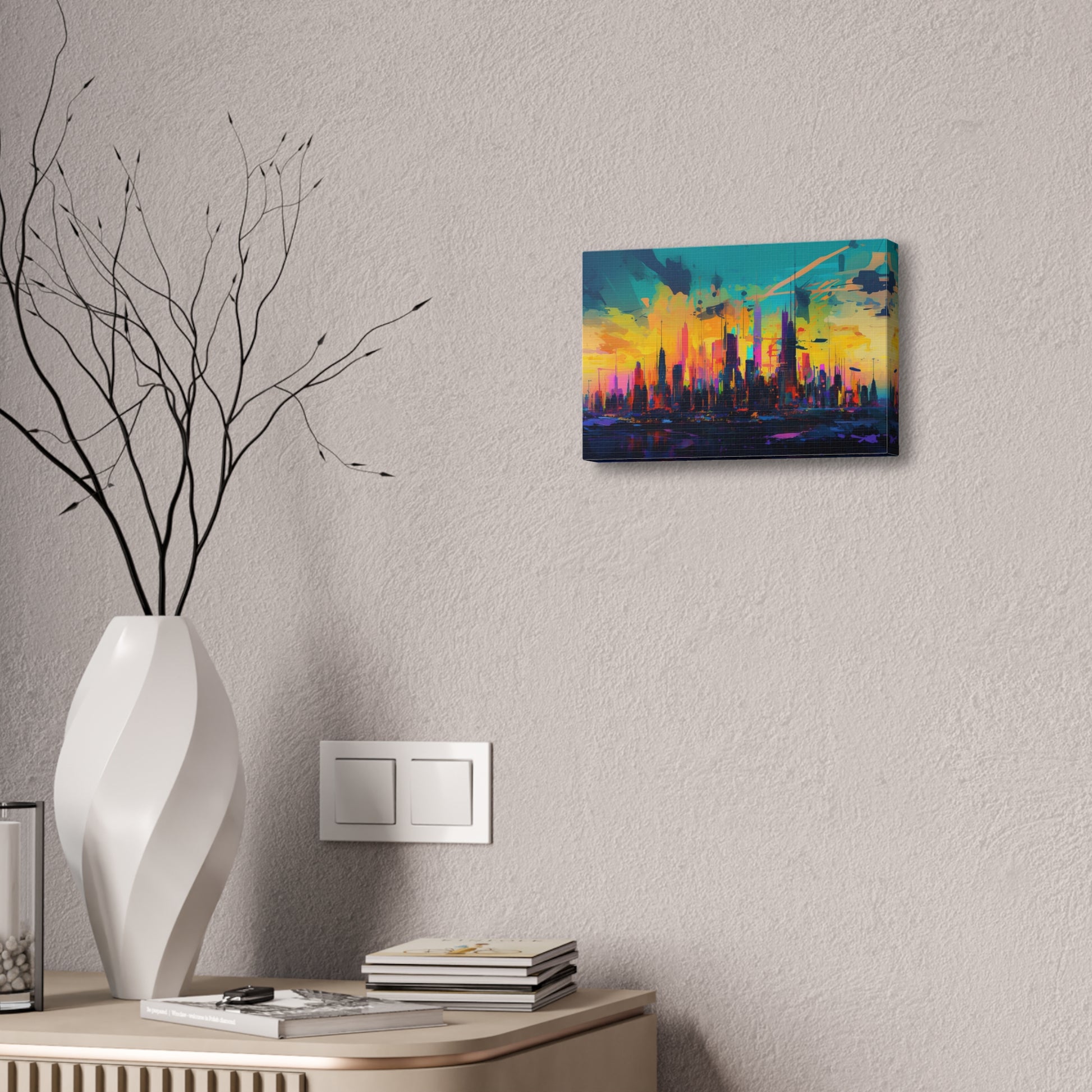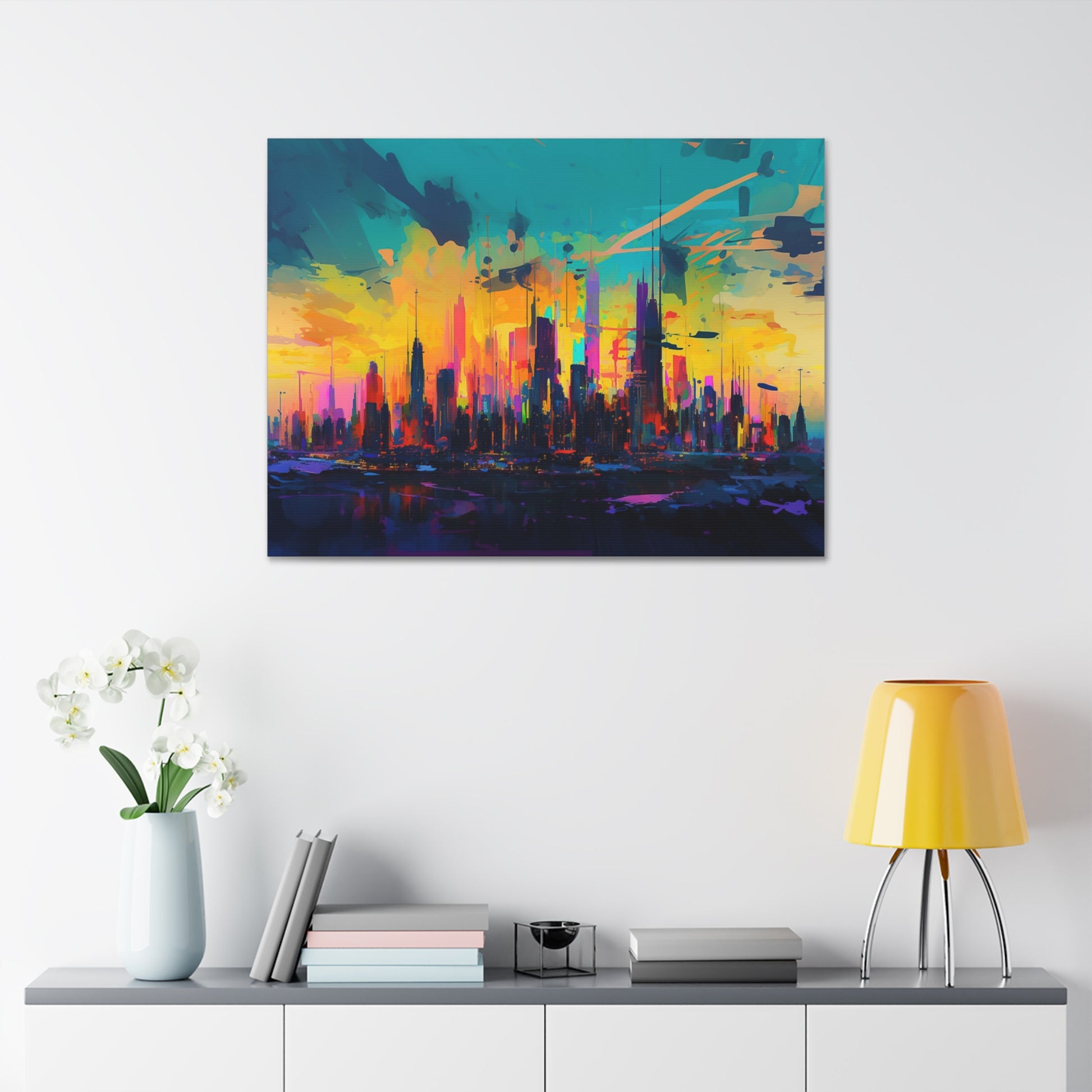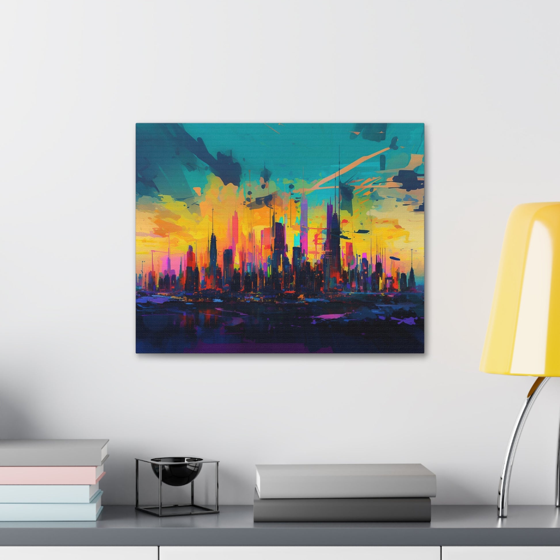 A beautiful depiction of an abstract city skyline exploding with color from the backdrop of a spectacular sunset. The art was created using painstakingly crafted word prompts submitted to AI technology with the intention of developing a breathtaking visual display guaranteed to brighten any room.