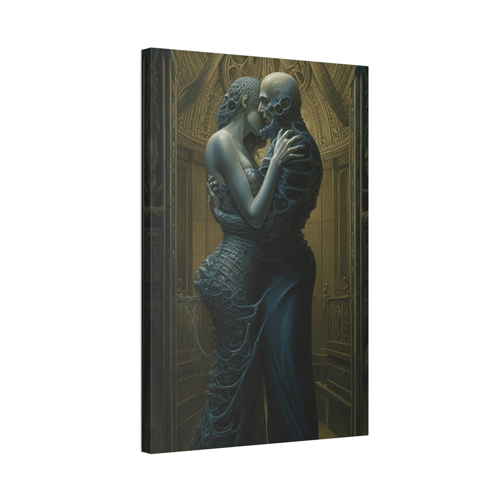 AI generated creepy, ominous, haunting, matte painting created by mixing styles of H.R Giger, Stanislaw Szukalski, Zdzislaw Beksinski with with Gustav Klimt's masterpiece, The Kiss. The art was created using painstakingly crafted word prompts submitted to AI technology with the intention of developing a jaw-dropping visual display guaranteed to create wonder and discussion.