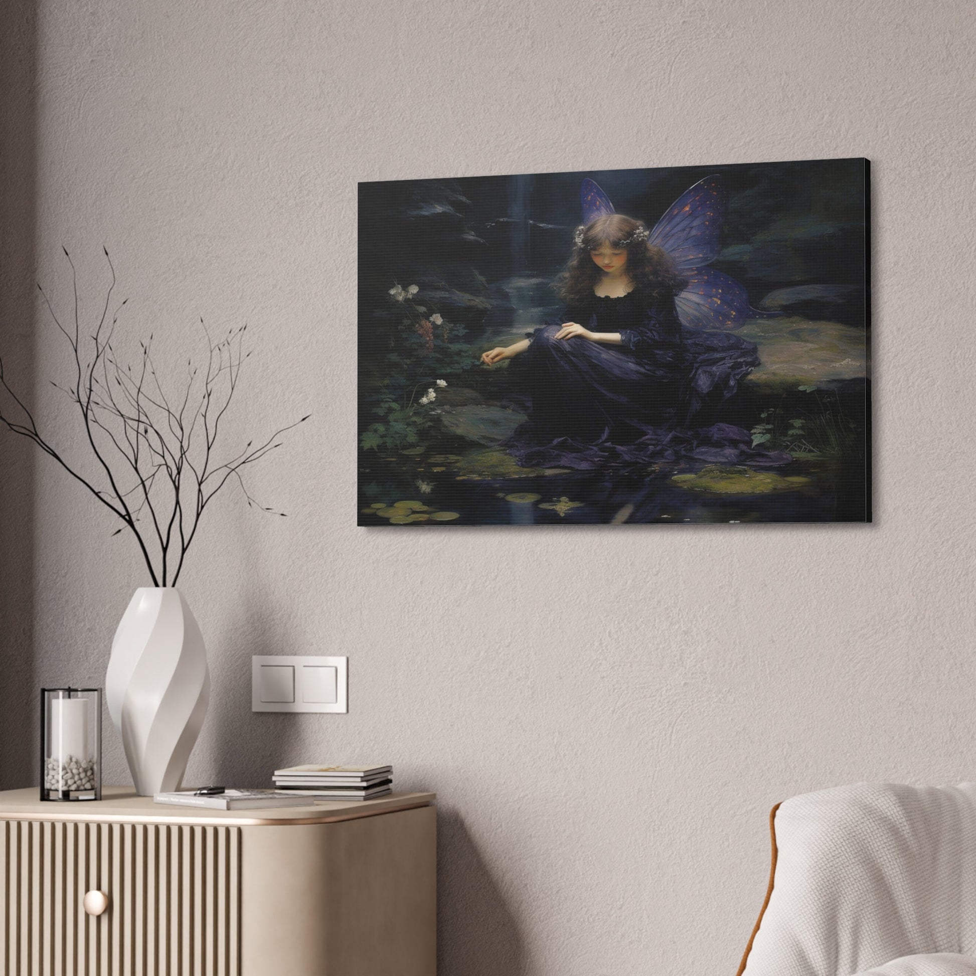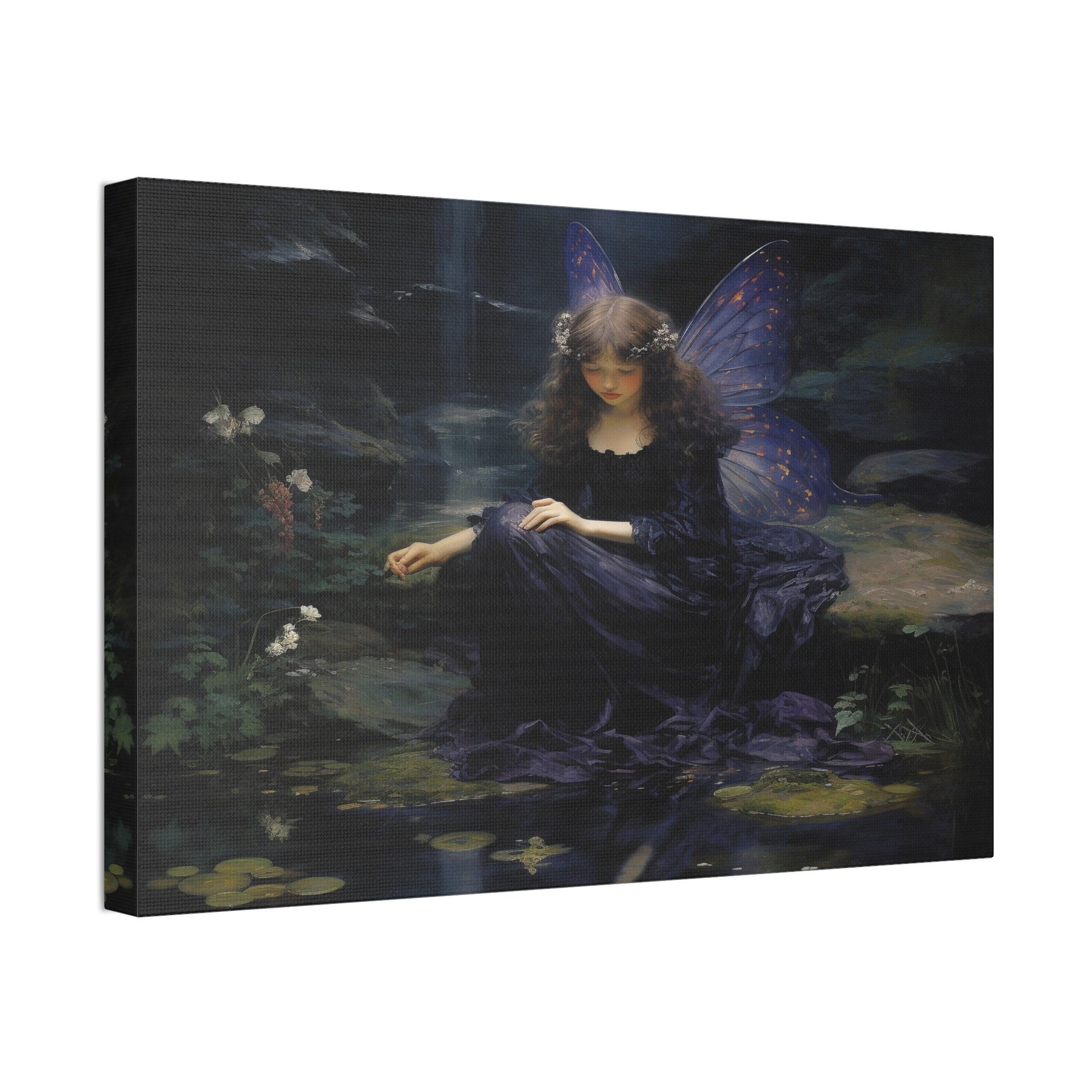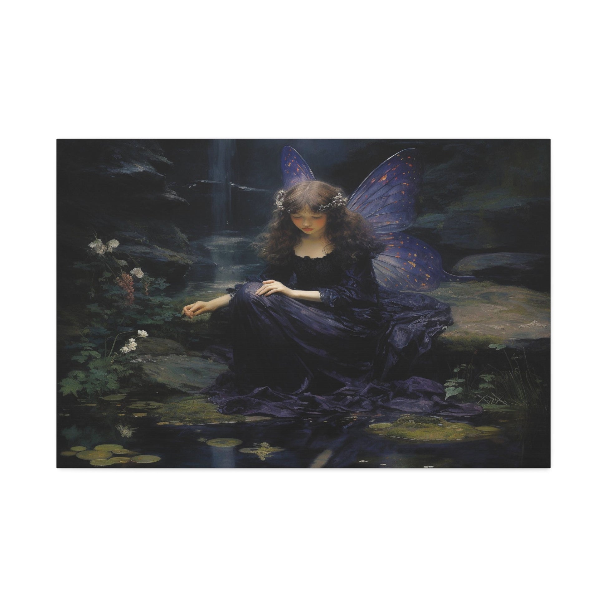 Purple Fairy Contemplation by a Forest Stream. Great for Personal room or Office. Cool enough to add flair at home, yet subtle enough for that professional feel at the office. The art was created using painstakingly crafted word prompts submitted to AI technology with the intention of developing a crisp yet fluid visual display guaranteed to create wonder and discussion.