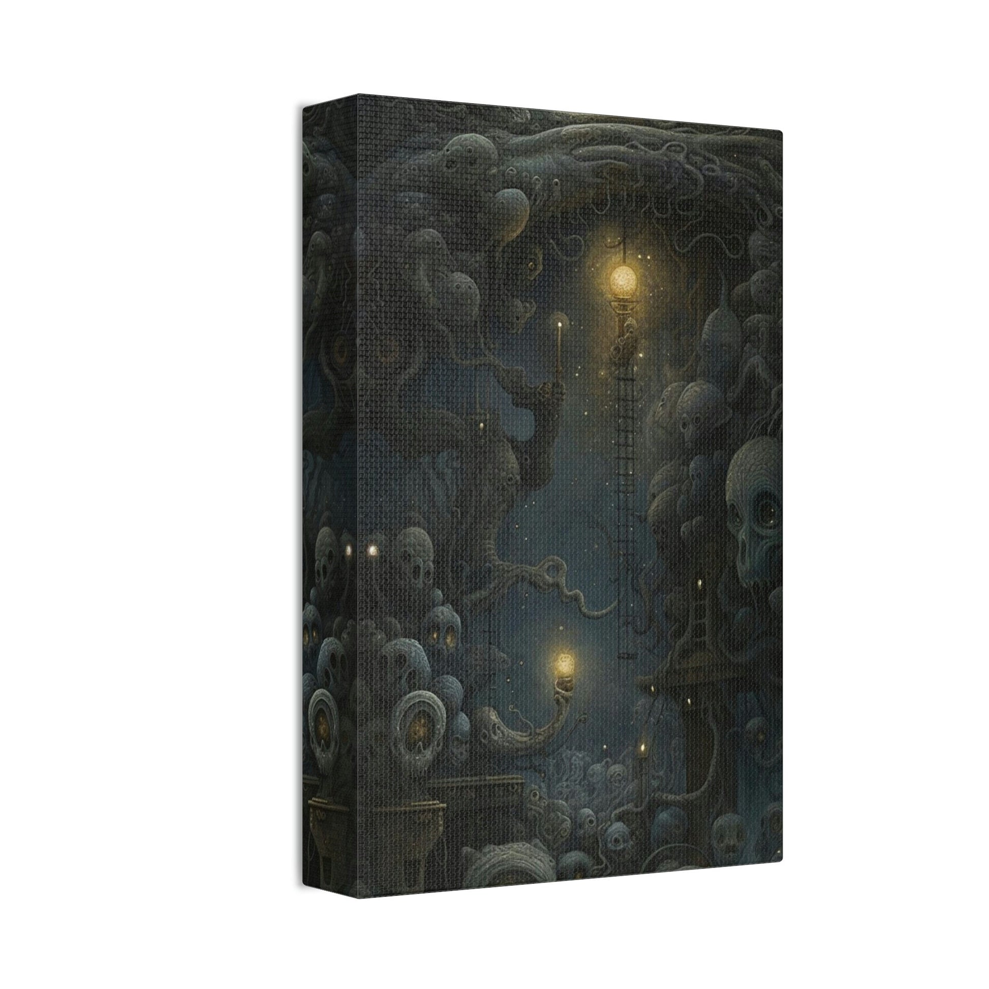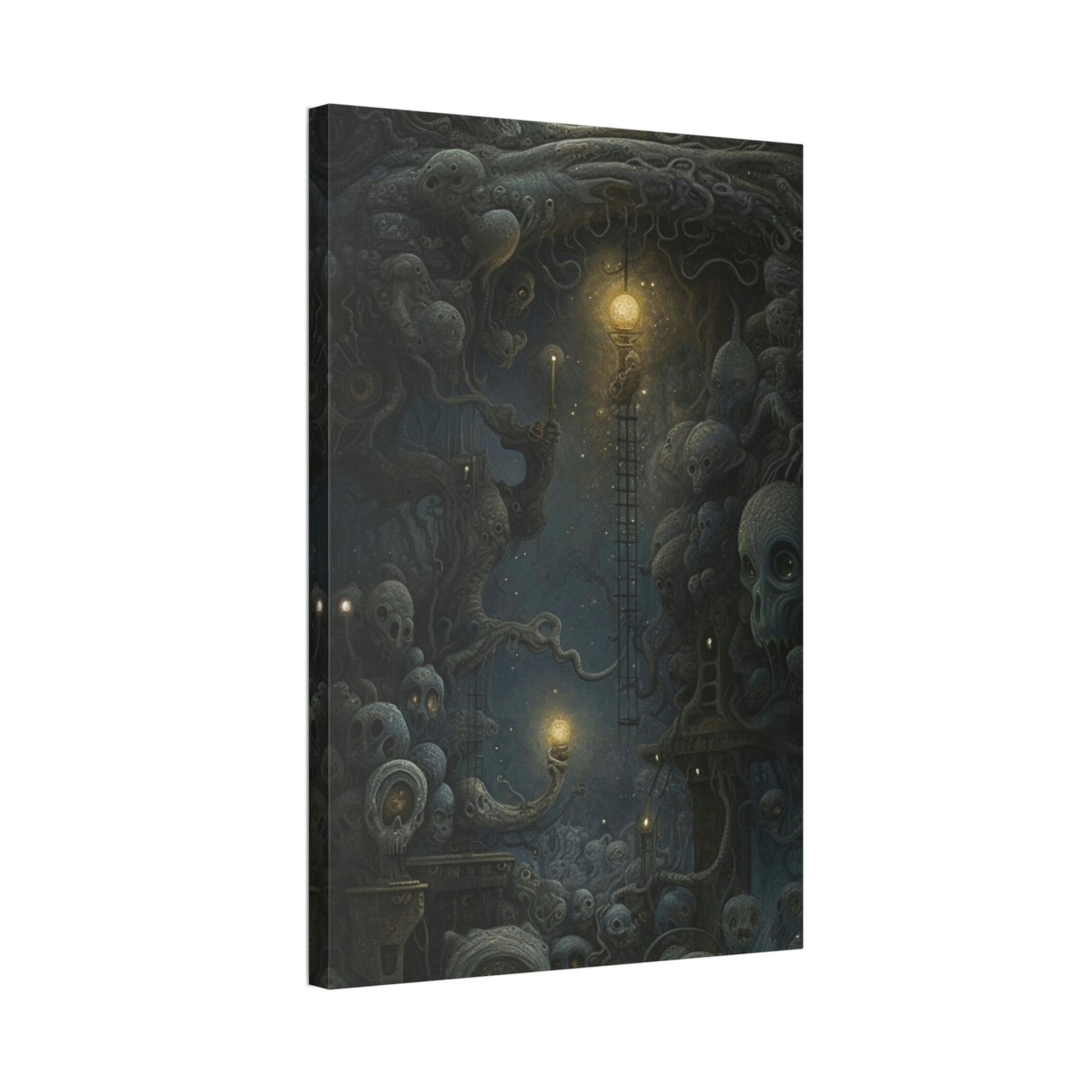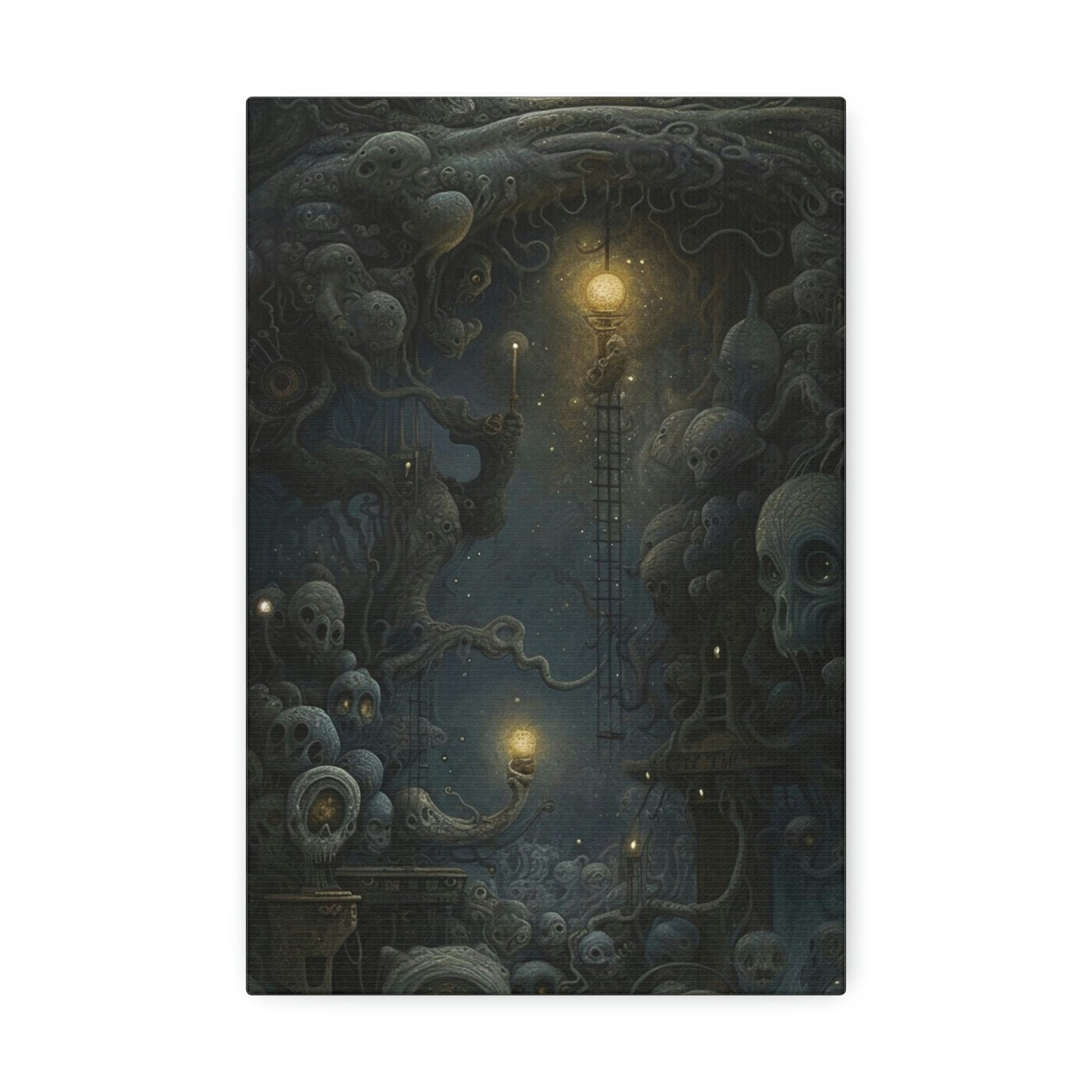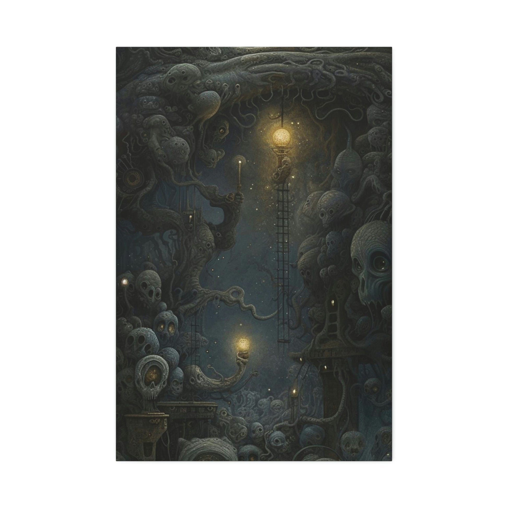 A Surreal Ai generated Art print loosely derived by mixing Starry Night and the works of H.R. Giger, Szukalski, and Beksinski.The art was created using painstakingly crafted word prompts submitted to AI technology with the intention of developing a breathtaking visual display guaranteed to create discussion and general awe.