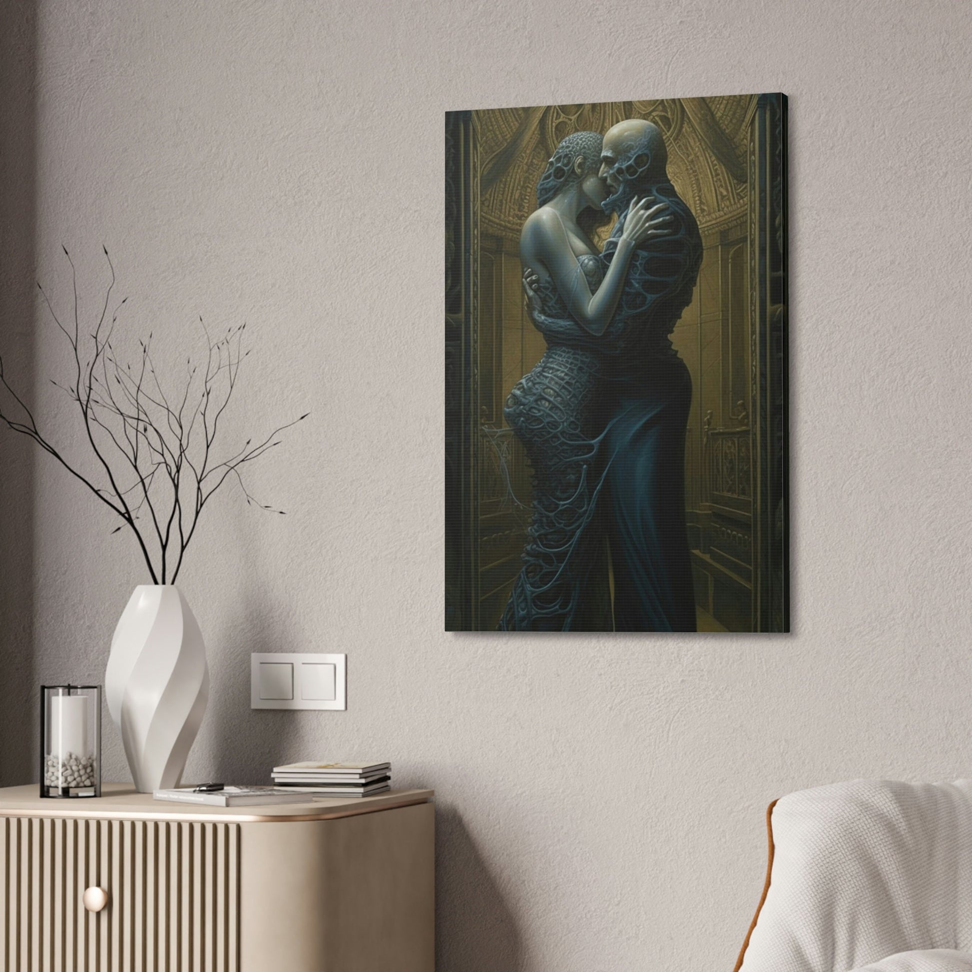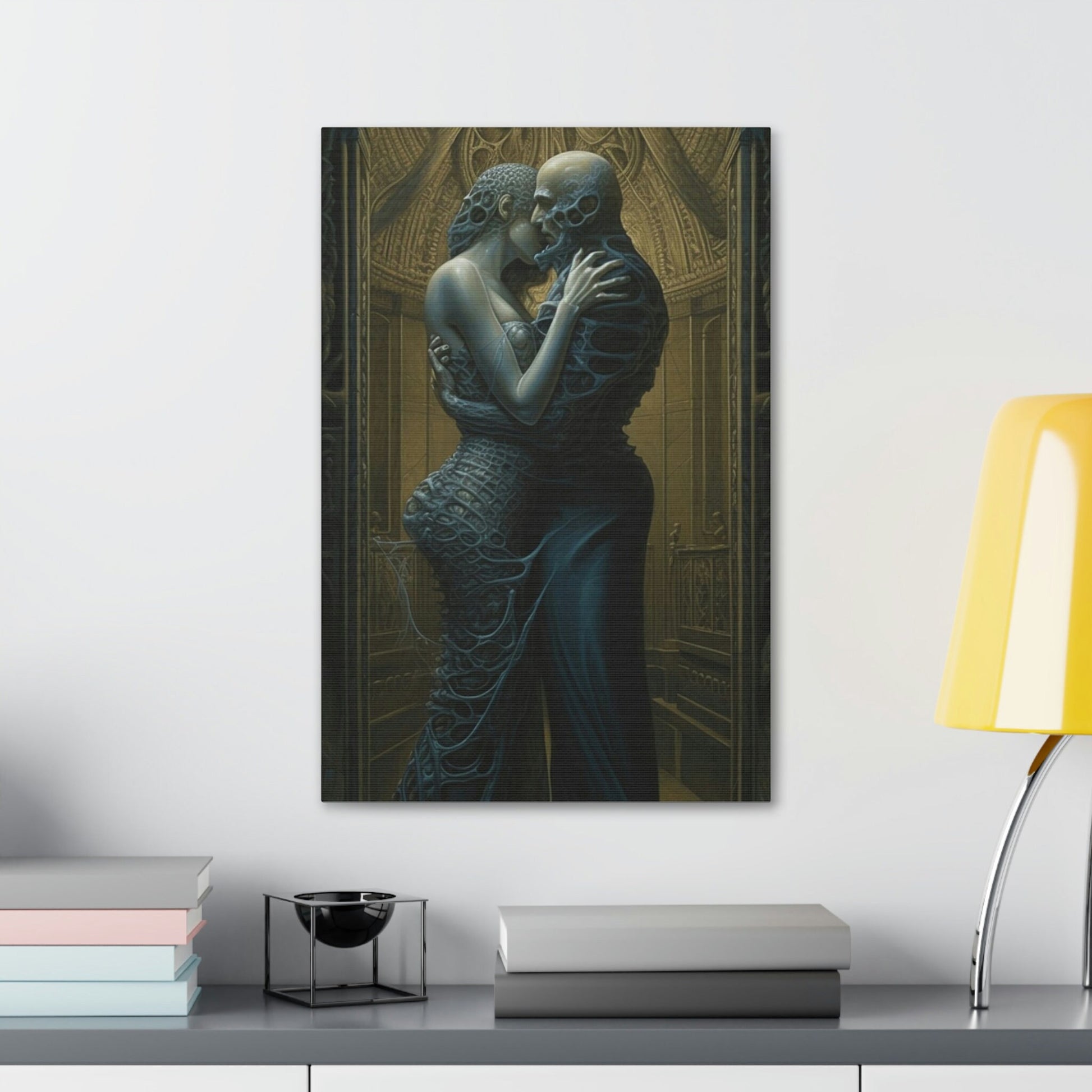 Unique wall art for college apartments or new homes | The Embrace: AI art influenced by H.R Giger and Gustav Klimt's Masterpiece, The Kiss