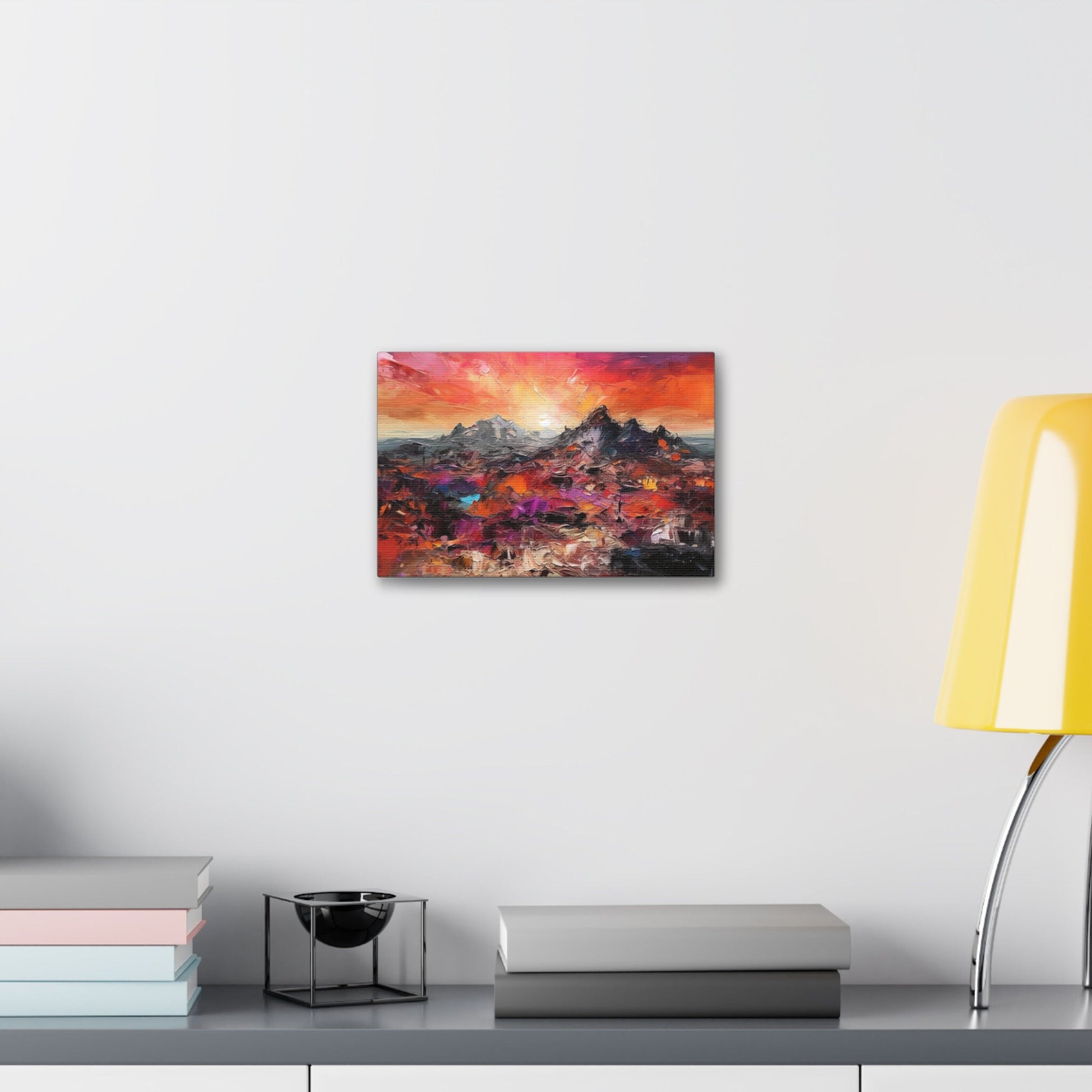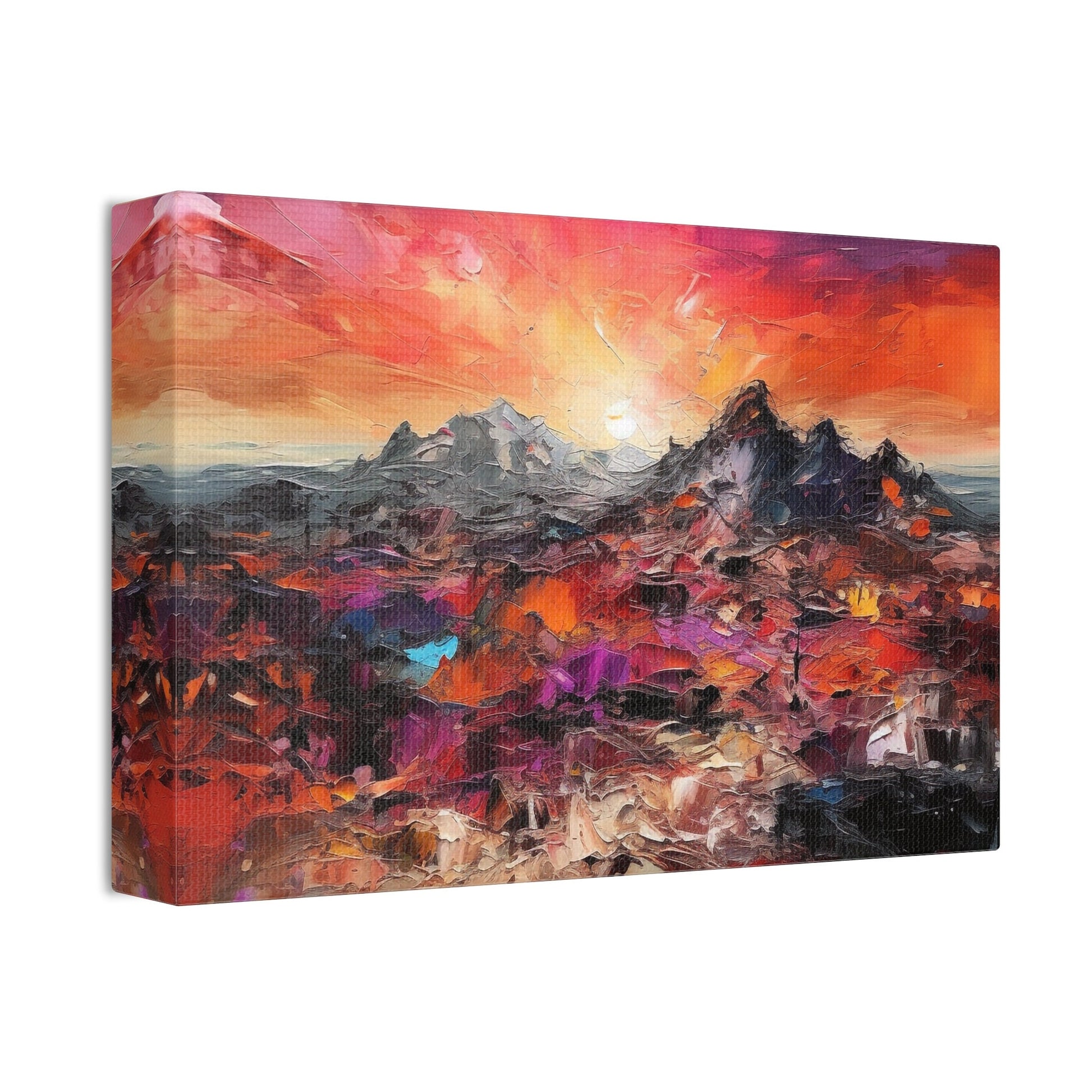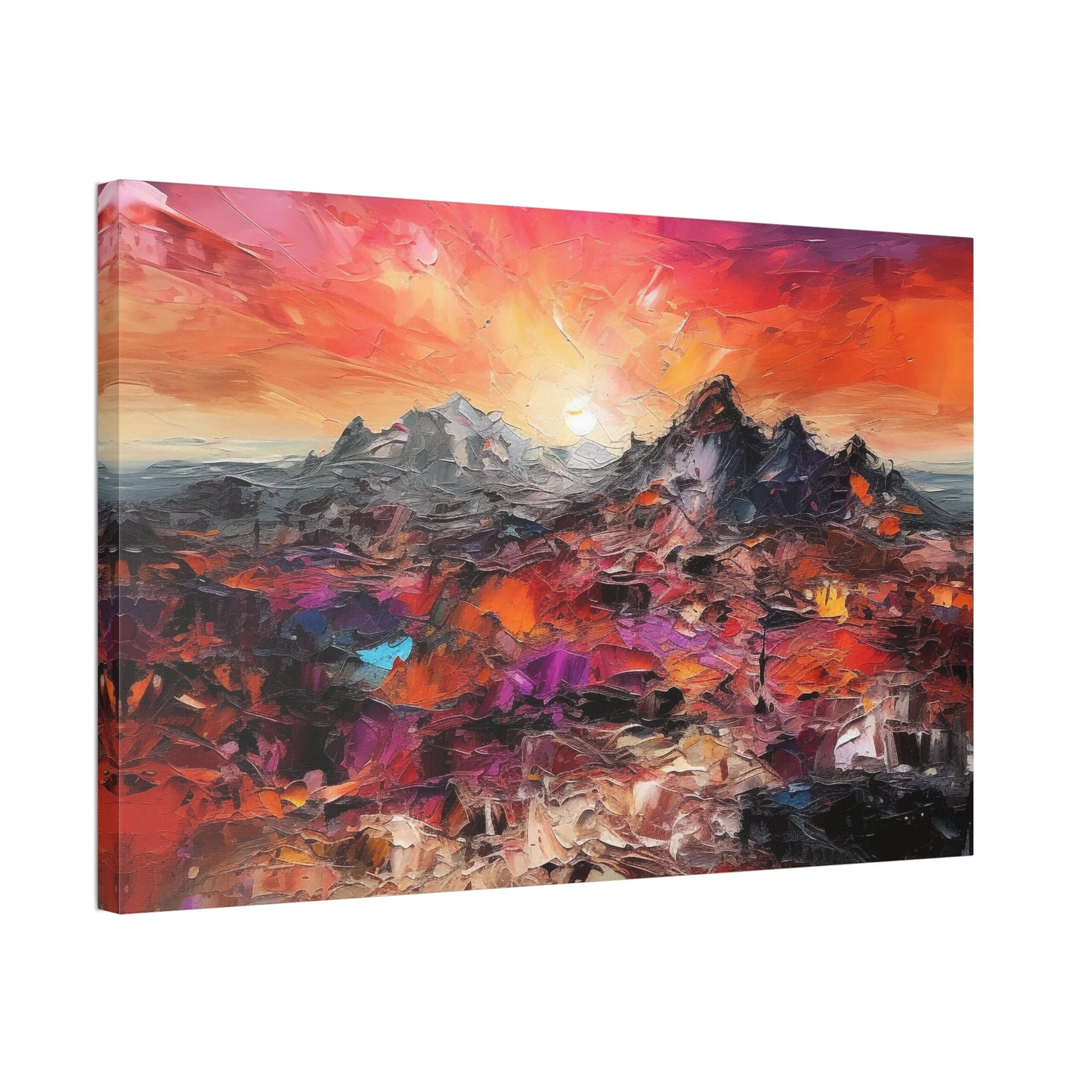 Transform your living space with this stunning abstract desert sunset wall art. This hand-painted canvas print captures the vibrant colors and dynamic textures of a breathtaking sunset over rugged mountains. Perfect for adding a touch of warmth and sophistication to your home or office decor, this piece is a conversation starter. The vivid hues of red, orange, and purple blend seamlessly to create a mesmerizing visual experience. Ideal for modern, contemporary, or rustic interiors, this artwork makes a perfect gift for art lovers and nature enthusiasts. Great to decorate that boring room in your house or bring your dorm room or apartment to life.